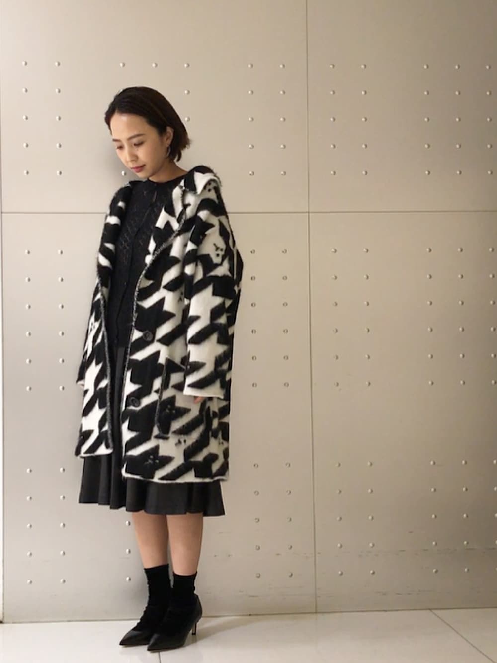 こんにちは😃 今日は朝から寒かったですね💦 週末寒くなるみたいです💦 さて、今日はとても可愛いアウターをご紹介します❣️ 千鳥柄の中を見ていただくと中にネコちゃんが😍🐈 存在感のあるアウターにインナーは別ショットをご覧下さい✨ レースの柄の様に繊細に編みこんであるニットにインナーはメタリックを合わせて以前にもご紹介した洗えるスカート❣️を合わせてみました❣️