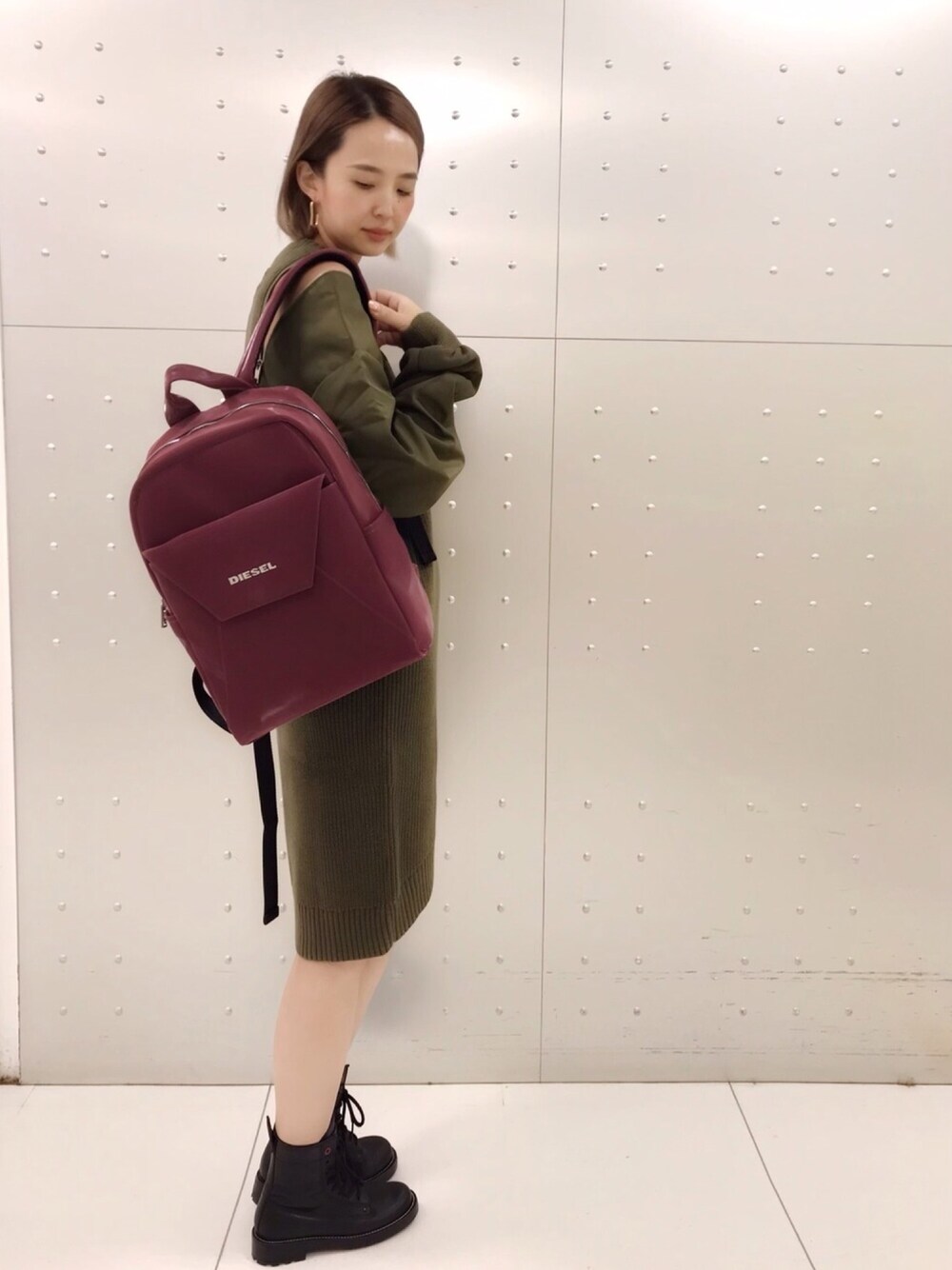 ベルベット素材のリュックは収納が沢山ありとても使いやすいです☺️カーキのワンピースと合わせて秋カラーにしてみました☺️