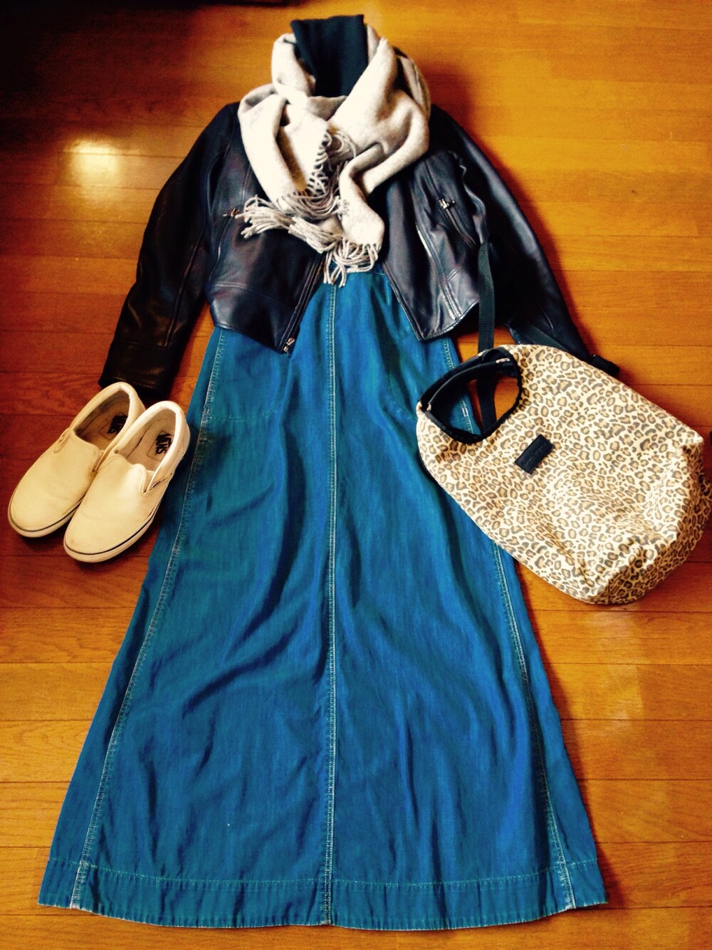 わかりにくいけどエプロンみたいなロングワンピです。またしても全身GAP笑 ストール:無印良品 タートルニット:GAP ライダース:GAP ワンピース:GAP