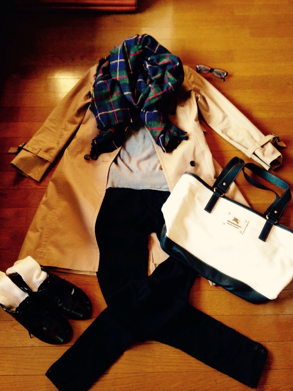 キレイめになりました!冬はチェックがやっぱりいい感じ✨ めがね:UNIQLO ストール:ZARA トレンチコート:ブランド不明 ニット:GAP パンツ:GAP 靴:3coins シューズ:FORK&SPOON