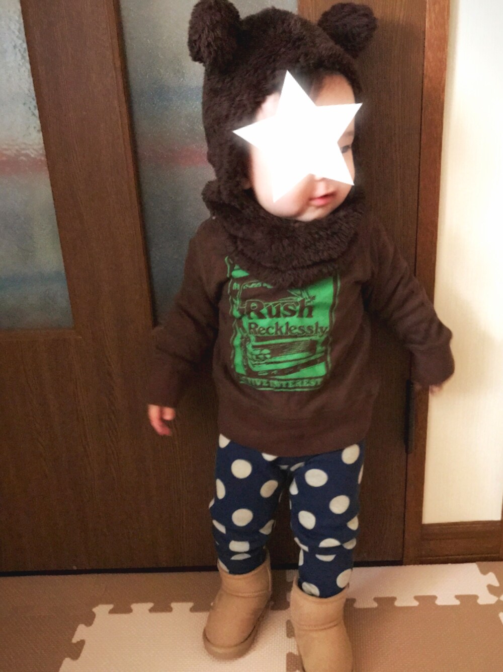 KF⍤⃝♡のニットキャップ/ビーニー「【GRIN BUDDY(グリンバディ)】耳あて付きクマの着ぐるみフード帽子/Kids Bear Puton」を使ったコーディネート