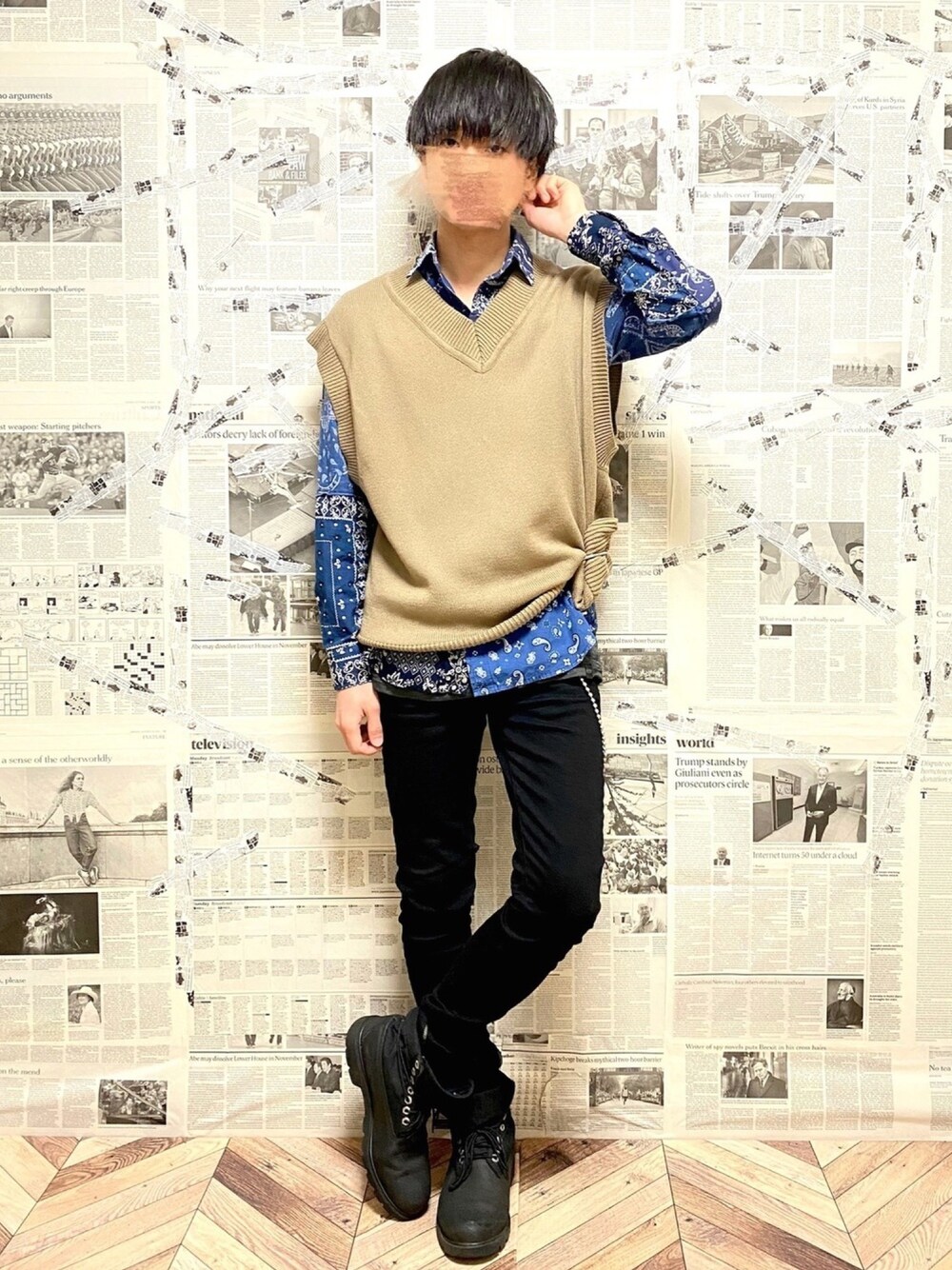 いつも閲覧ありがとうございます🏔 ニットベスト × ペイズリー柄シャツ Freak's Storeのベストは オーバーサイズなのでピンで留めてみました◎ コロナやばいですね… 自粛!!