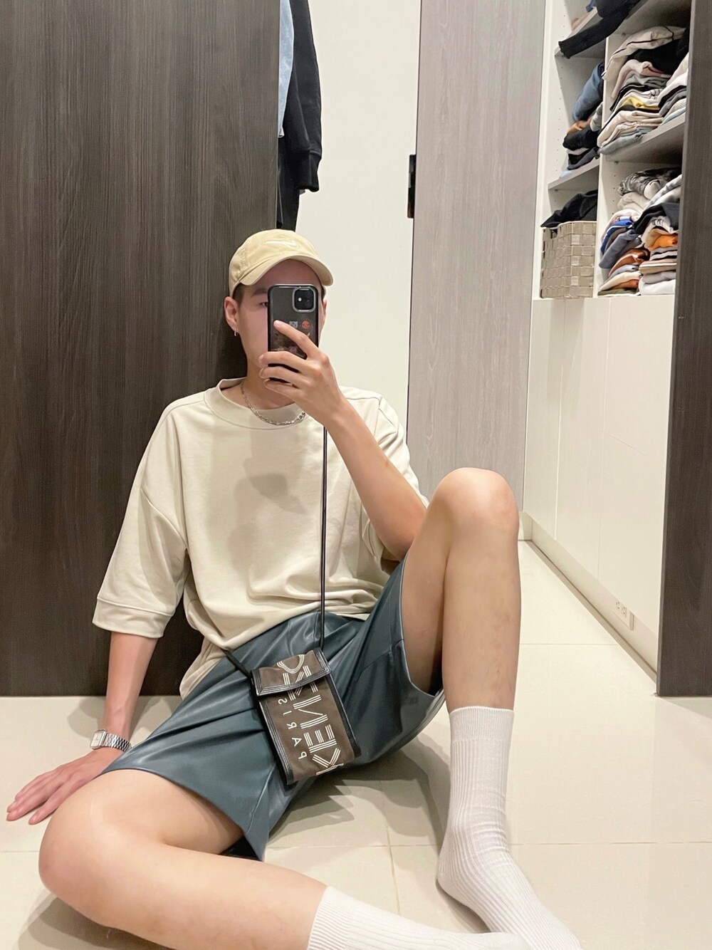 ベージュ系のTシャツ/カットソー、グリーン系のバッグ、ベージュ系のキャップを着用したメンズの夏コーディネートの1枚目の写真