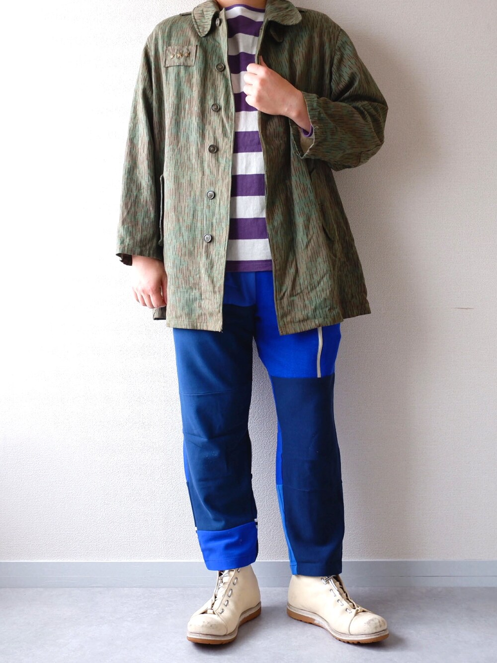 今日はミリタリージャケット+リメイクジャージパンツ、 スニーカー→レザーシューズへ そろそろ革モノに!