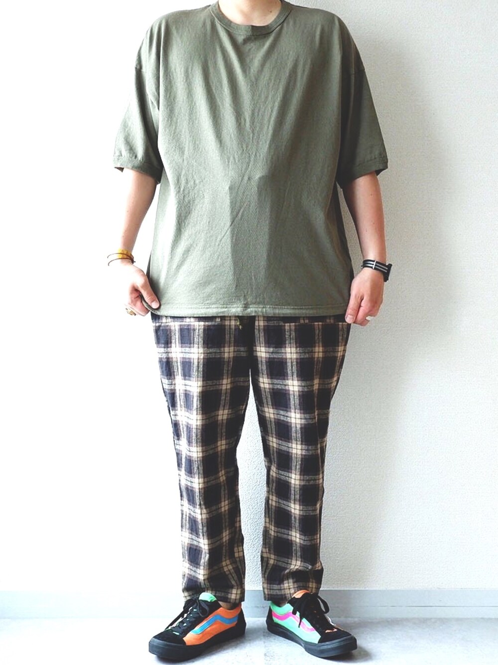 オーバーサイズのTシャツにチェックパンツ! 足元はバンズ。 暑さとともに、装いもシンプルに💡