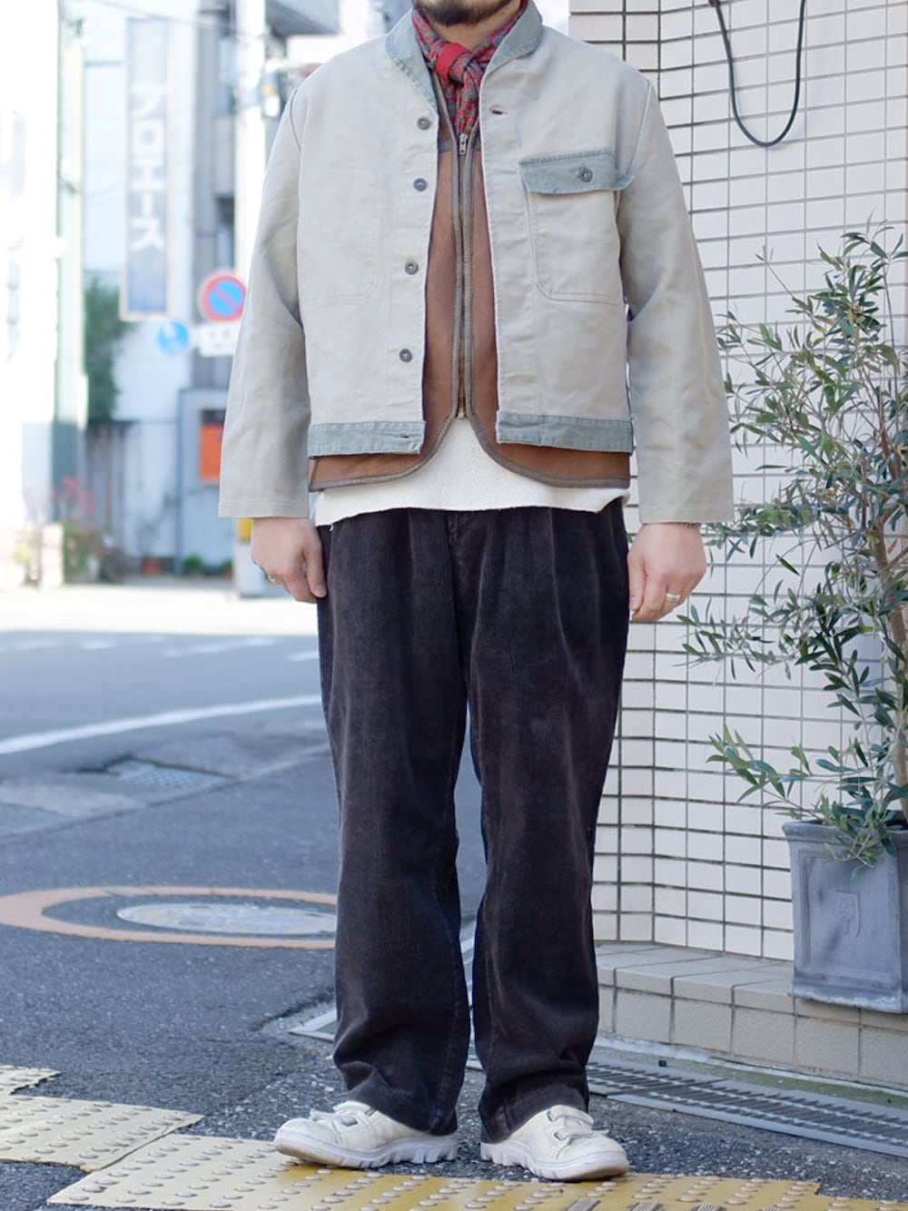 おはようございます! 今日は全身古着、ビンテージもので💡 フレンチワークのショールカラージャケットはツートンカラーのちょっと珍しいもの インナーにサーマル、シープスキンのレザーベスト、首元にビンテージストール パンツはラルフローレンの太畝コーデュロイにポルタユのベルクロブーツ こんなワーカースタイルで出発します☆ ではでは皆さん良い一日を🌈