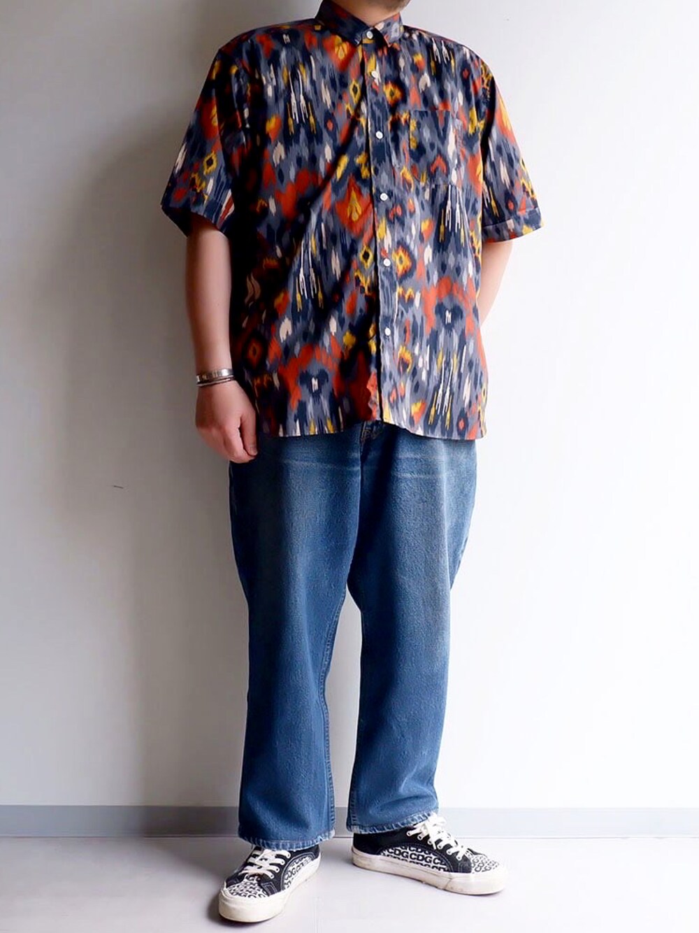 おはようございます! 何柄とは説明しずらい柄シャツ 今日はシンプルにシャツにデニムにスニーカーで! デニムはちょっとリメイクされたワイドテーパードシルエット💡 今の気分にハマりました😙 ではでは皆さん良い一日を🌈