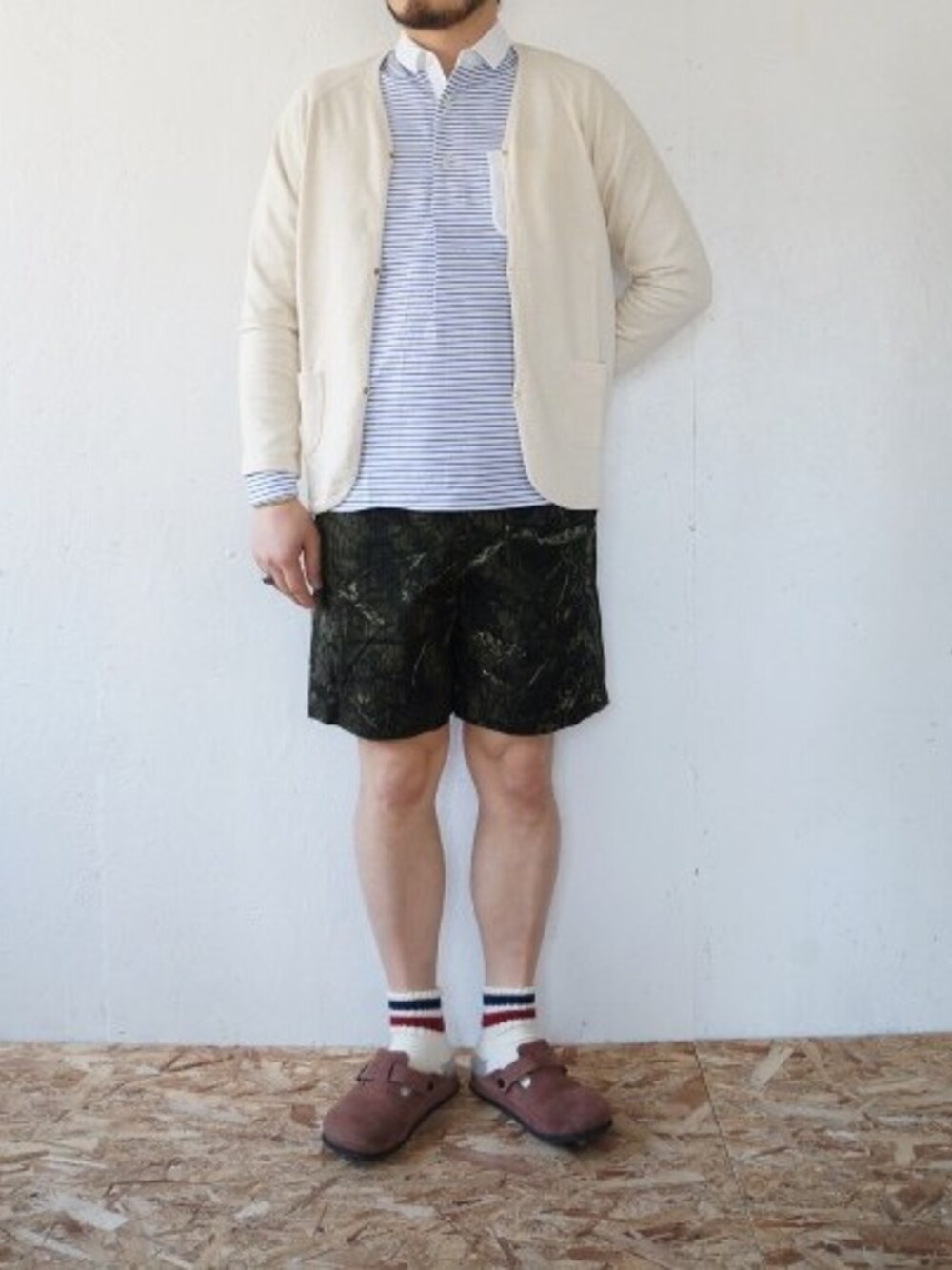 シンプルイズベスト‼︎ Weac.のプルオーバーシャツにTieasyのカーディガンを♫ ショーツはクーチューキャンプのリーフカモで😙 足元はrototo+ビルケンのボストン
