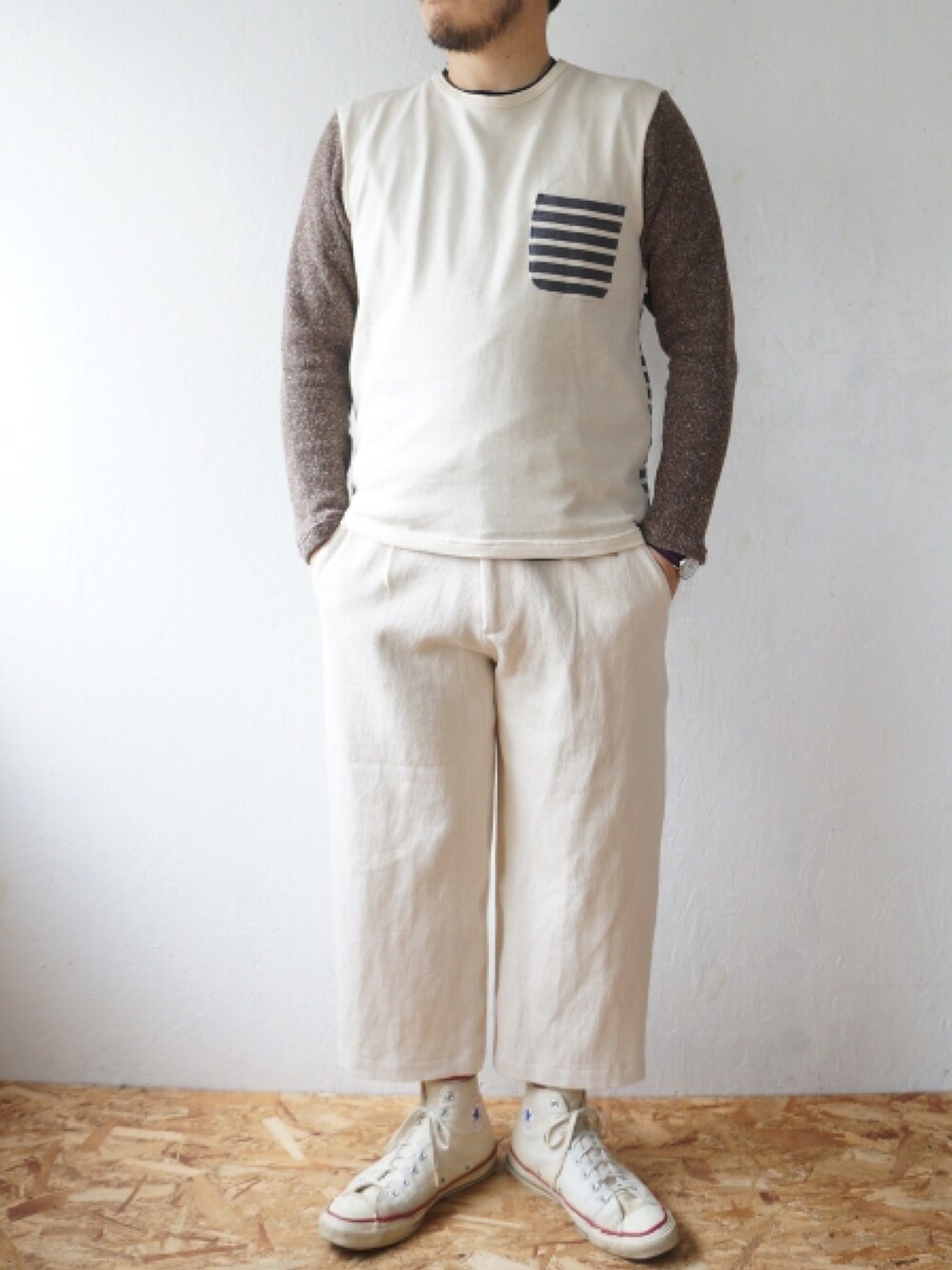 ホワイトのワントーンコーデ 8分丈のワイドデニムパンツがお気に入りですね♫ 裾幅がが広いので、ビックサイズの70sオールスターを合わせ、バランスをとりました。 masterkeyの秋冬物も面白いアイテムがたくさん有りますね😙👍 このパンツはセットアップとして、ジャケットもリリースされるんです♫ 白+白のセットアップチャレンジしてみたいですね😙✌️