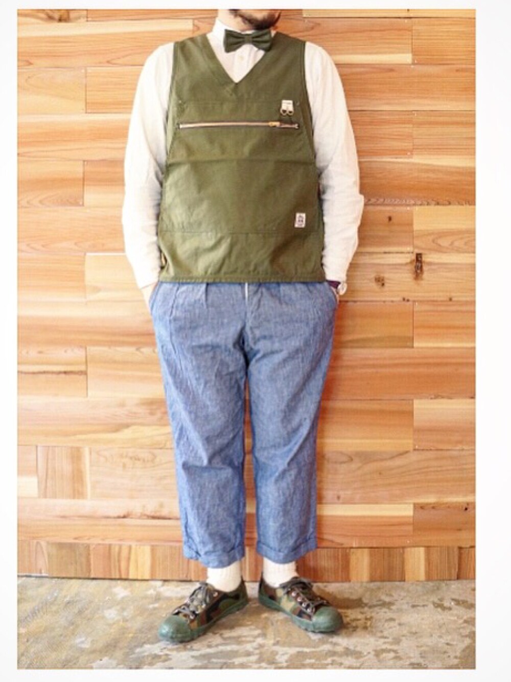 週の始まり月曜日、今日も皆さん一日お元気で! 今日はボウタイ&ベストのセットアップに、15jyugoのシャンブレー素材のタキシードパンツをあわせました♪ 暑い一日になりそうですね〜