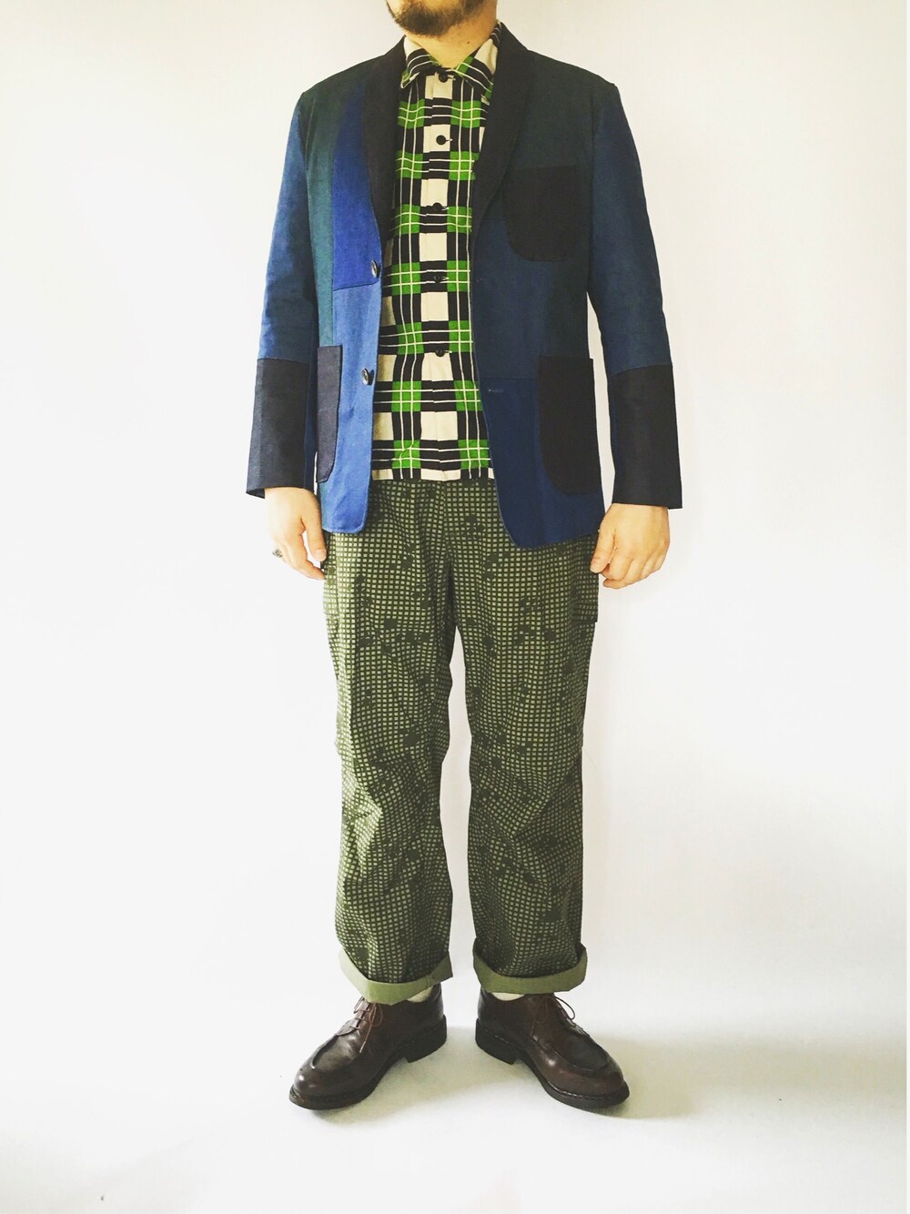 今日は秋らしくちょっと肌寒い朝になりました。 テーラードジャケットはデニムのパッチワーク、 インナーはキューブチェック、 パンツは米軍のナイトカモ、 デニムブルー×カーキは鉄板ですね! では皆さん良い一日を☆