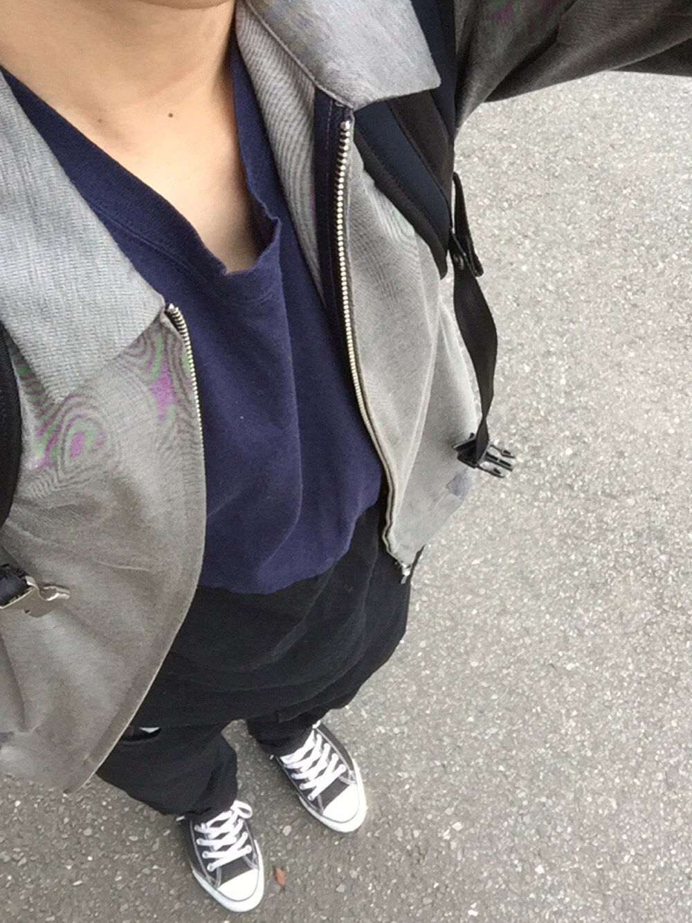 今日は半袖Tシャツにジャケットを着ましたが、それでも全然寒いです。もう少し厚着したほうがよかったです。 写真撮ったら今日はvictimばかりということに気付きました。 ジーンズとTシャツはシックな色だったので、灰色のきれいなジャケットにしました。 ジャケットがきれいなので、スニーカーとリュックでカジュアルにしました。