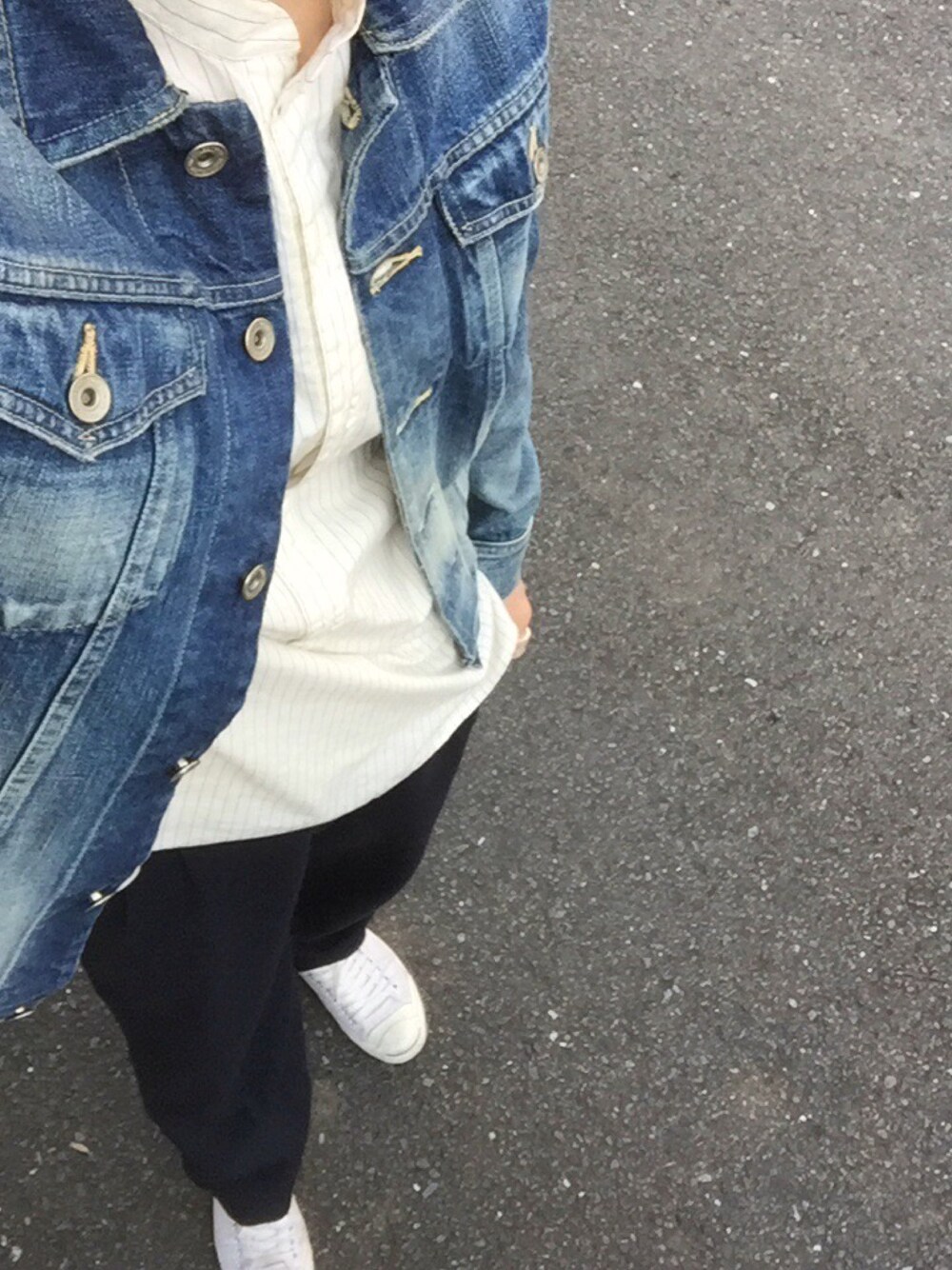 ずっとやりたかったスタイル。 ウールスラックスにデニムジャケット。 インナーにストライプシャツ。 デニムジャケットはジャストサイズ、ウールスラックスとストライプシャツはルーズシルエット。