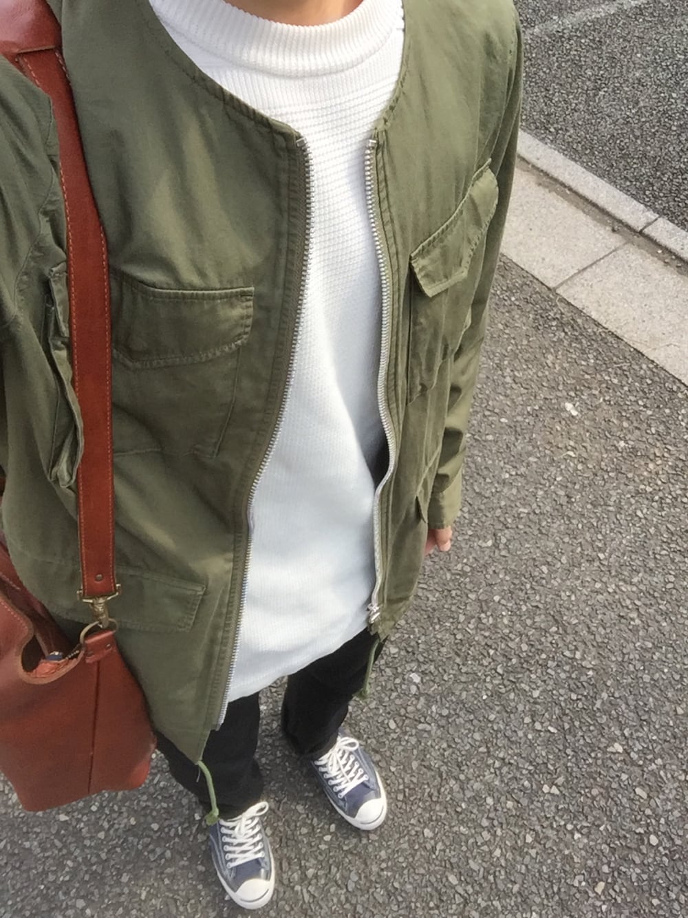 ルーズなシルエットのM-65に、ロング丈の白ニット。 上がゆったりしたシルエットなので、細身のデニムを選んでVラインで。 全体的にカジュアルなので、革のトートバッグでカジュアルになりすぎないように。