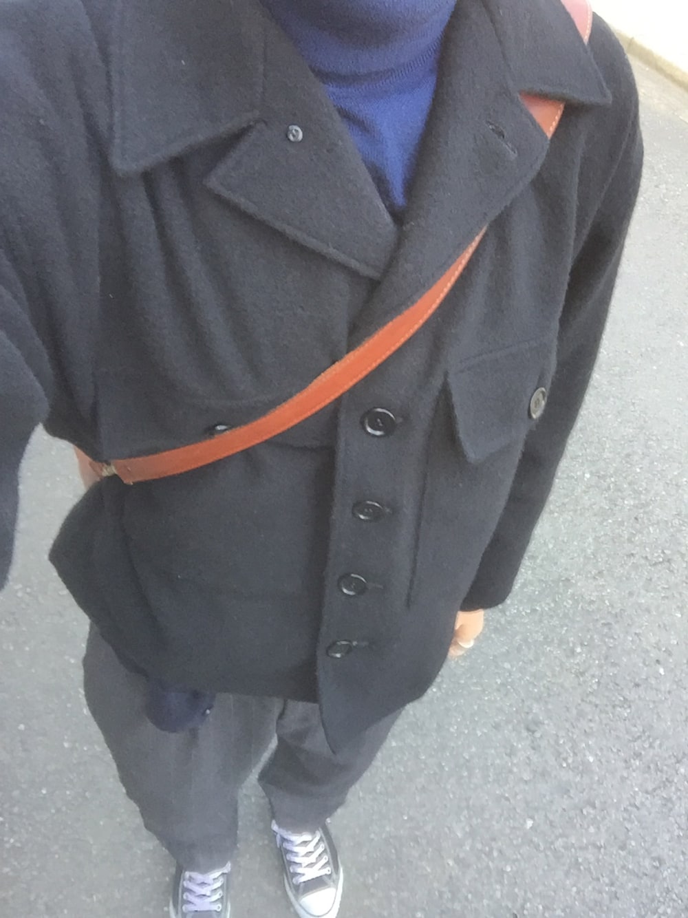 おじさんっぽいスタイル。 になりすぎないようにネイビーのタートルを首元から見せてみました。