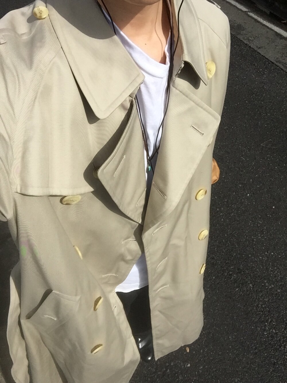 とにかくこのトレンチが着たくて、暑いのを我慢。 重いしキッチリしてる印象なので、ダメージタンクトップに全部ゆったりシルエット。