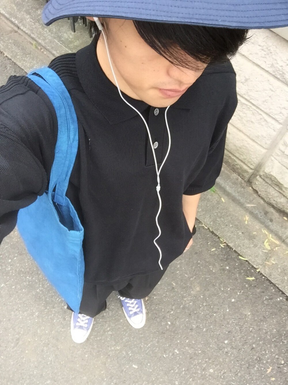 黒と青だけコーデ。 めちゃくちゃ気に入ってます。 家庭科の授業で作ったトートを藍染したこいつお気に入り。