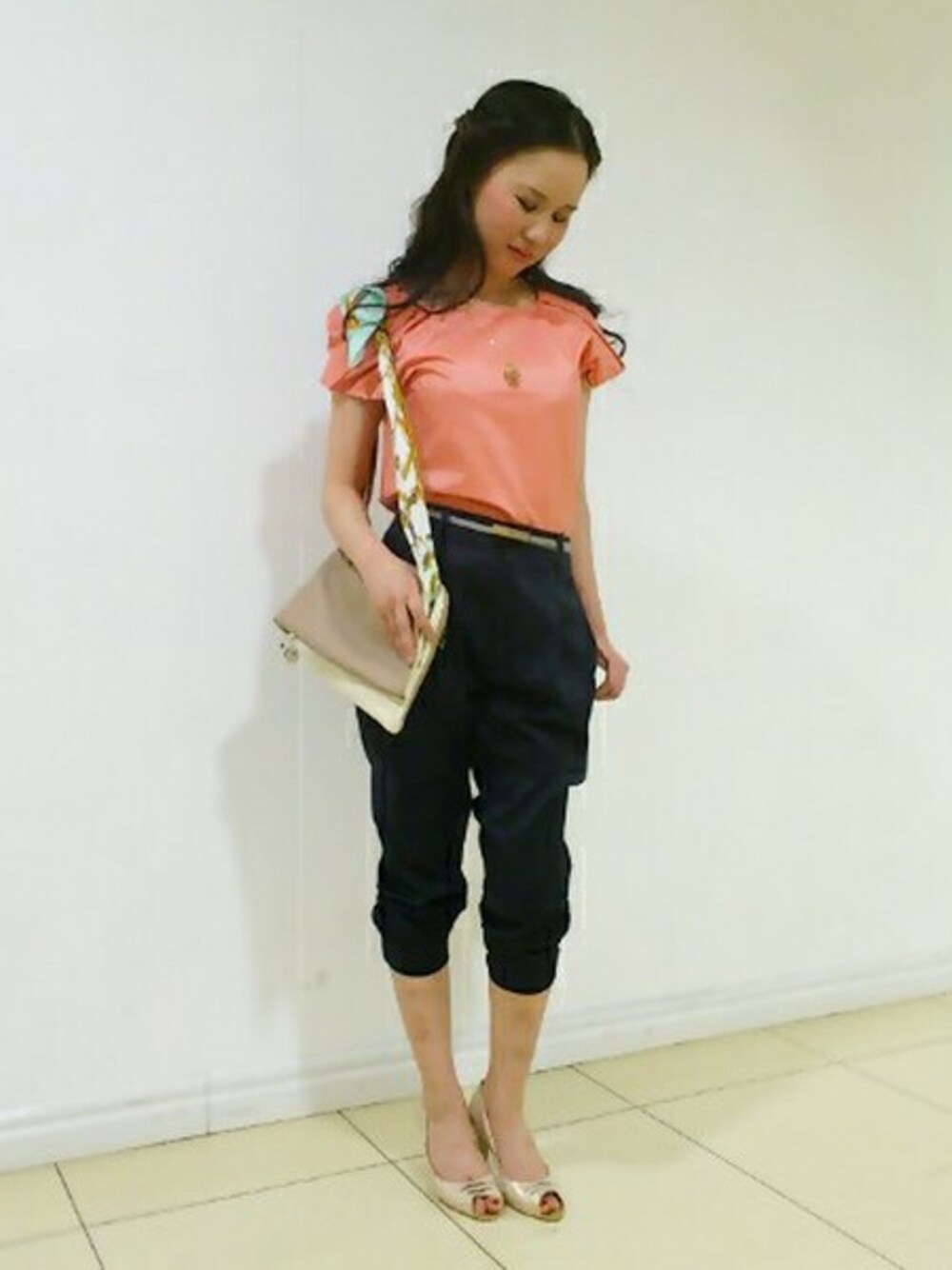 人気の裾ゴムパンツをピンクのブラウスで上品華やかに!
