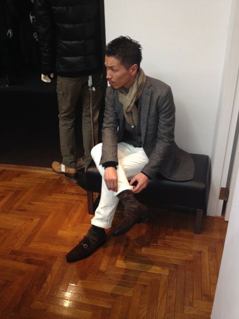 ウールジャケット×コーディロイパンツ 素材で温かみのある素材同士。だから見た目にも柔らかな装いになる。 ジャケットはロング丈が今季は◎