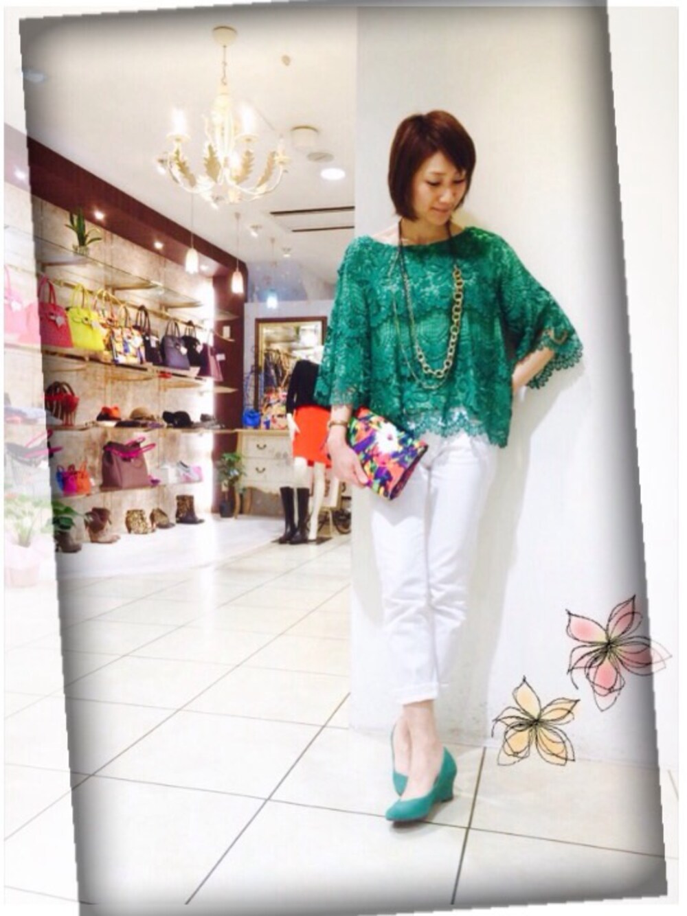 「GREEN×WHITE」 大好きなグレースのレーストップを着ました♪ フラワープリントのクラッチBAGをポイントに🌺