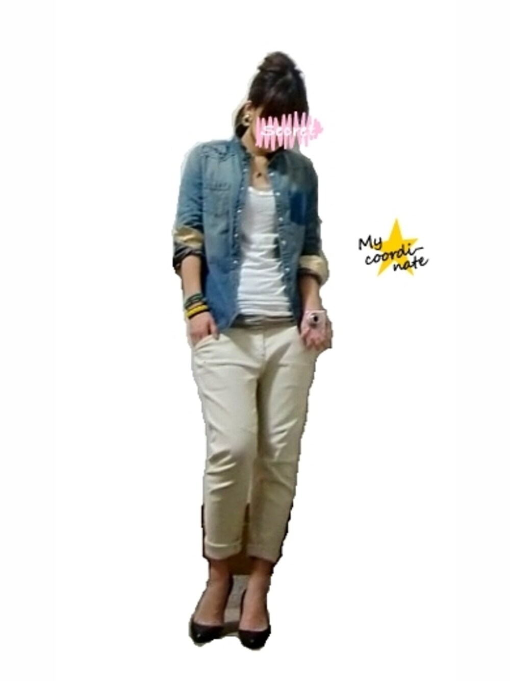 シンプルコーデ。 ダンガリーシャツは何枚も持ってるけど、 これはずーーーっと探してたデザインだったので、即買い☆ メンズっぽくなりすぎないように、シャツのタイトなシルエットを生かして シンプルで襟ぐりがあいたカットソーと、ヴィンテージイヤリングで女度UP。