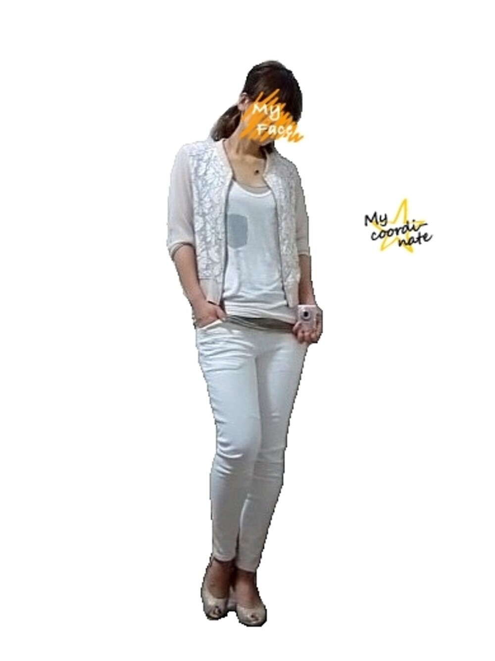 白コーデ。 素材違いで着る白コーデ。 全体が綿100だと、ナチュラルすぎるのでブルゾンを着て大人っぽく。 のべ~っと見えないように、グレーのタンクをインナーにしてちら見せ。 レースブルゾンは甘すぎないのでお気に入り♪ ポケットがプリントしてあるタンクは、カタチ、長さ、ともに◎。 白パンは、少しサルエル型になっていて脚がキレイに見えるので Mも持ってますが、Sサイズも最近購入。 シルエットが違うので、コーデの幅が広がりそうです★ 内側がリブになってて、ほんとに楽ちんなのです♪