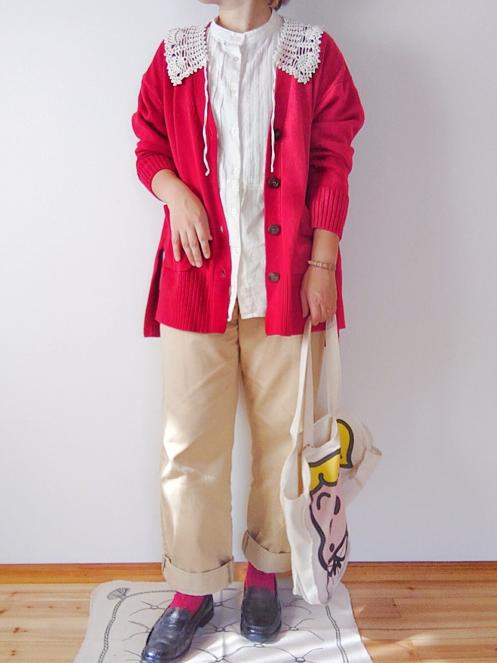 可愛く赤を着たい日のコーデ ガーリーに着たかったのでつけ襟肩にかけてみました。