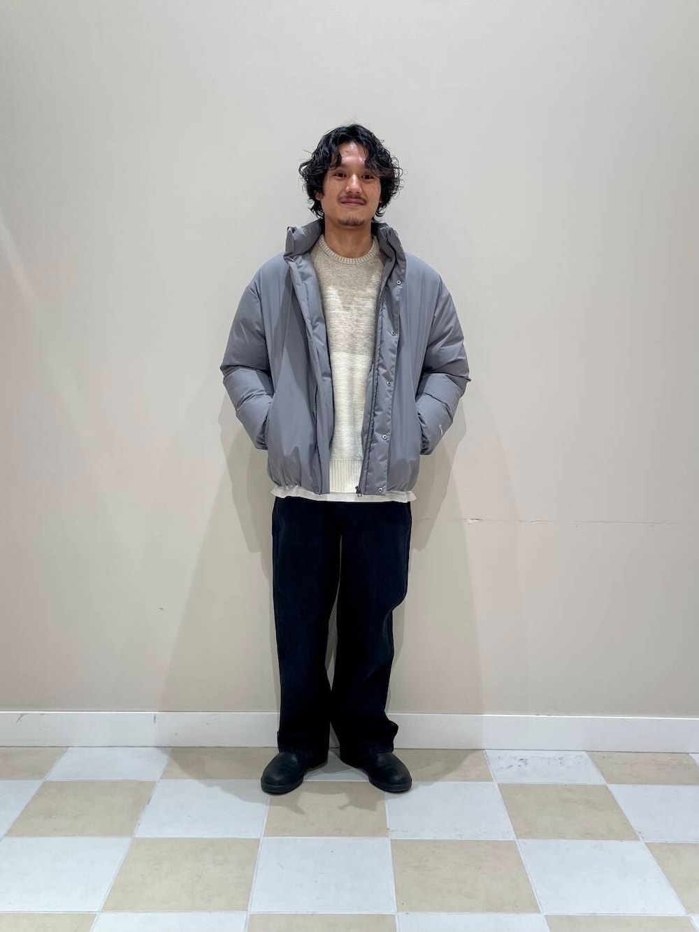 丸みのある中綿のスタンドカラーブルゾンを使ったコーディネートです! 今っぽい短丈のデザインで、スッキリとしたサイズ感になっています! 保温力もあり暖かいです! シンプルにデニムと合わせたコーディネートにしてみました! アウター、インナー、パンツ全てMサイズを着用しています!