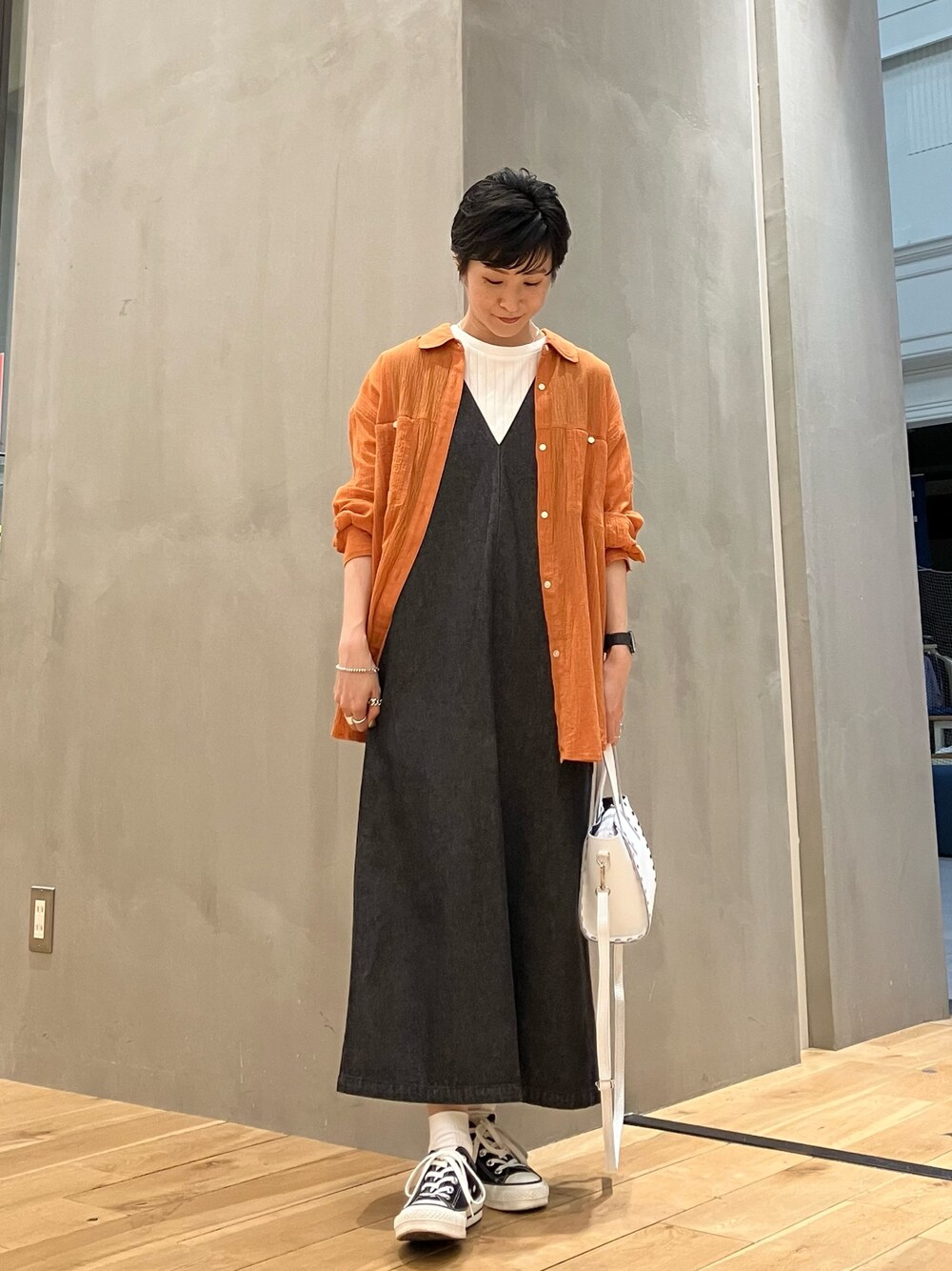 先日の仕事着〜 DOORS WOMENS 夏物がまだまだお得にお買い求めいただけますよ〜 なコーディネート! 7/8のスタイリングでも着ていた コットン楊柳ルーズシャツ DR45-23W108 を着回し。 ゆとりありつつオーバーサイズ過ぎないシャツなので、ワンピースなどの羽織りとしてもバランス良く合わせやすいです◎ ブラックなど濃色と組み合わせるとこの透け感。 今回はポイントでブラックとホワイトを。 ジャンパースカートはDOORSオリジナルの過去商品。 気に入った物をいつまでも着ています定期。 Tシャツは定番の DOORS 針抜き半袖カットソー DR45-21U107 毎シーズン購入ぐらい買っているのでいつのだったか...。24年夏物紐付けしておきますね。 柔らかくて伸縮性もあり1枚でもインナーとしても着やすいので、1着あるとめちゃくちゃ便利です。 袖丈/カラーリングと、年によってデザインもアップデートされながら毎シーズン展開していて、 この秋も6分袖から入荷予定ですので、気になる方は是非チェックしてみて下さい◯ バッグは AULENTTI 2way スタッズショルダーバッグ DW46-DI-3202-DO "AULENTTI (オウレンティ) は2019年にスタートしたバッグブランド。バッグ産業の盛んなイタリア・フィレンツェを中心としたイタリア国内のファクトリーで生産されています。イタリアの質の高い牛革を多く使用。" 白のバッグですが、パキッとした色味とスタッズで甘くならずにクールな印象。マチもしっかりあるので物もある程度入りそうでした。ショルダーで肩や斜めに掛けられるのも嬉しいですよね〜 シューズは安心のコンバース。 冷え性なので夏もスニーカーを愛用。コンバースも一年中履いてます◯ 今から秋もイメージした仕事着でした〜