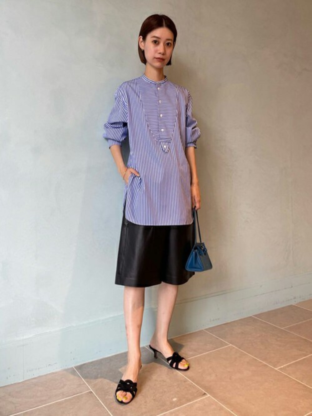 〈MACPHEE〉のストライプシャツをメインにコーディネート。 デザインがボザム部分で切り替わっていたり、袖口の珍しいボタンの仕立てがポイント。 レザーのハーフパンツと合わせてハンサムにまとめました。