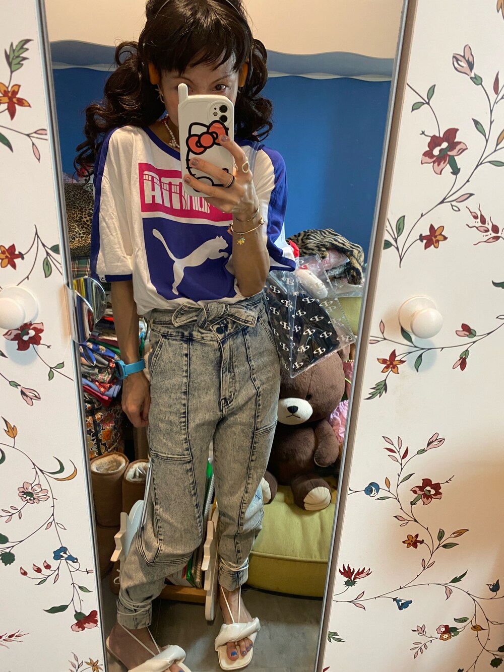 17 June 2023 Saturday 🌧️⚡️☔️ · ❤️💛💚💙💜❤️💛💚💙💜❤️💛💚💙💜 #Today outfit 🍄藍拼玫紅色PUMA圖案Tee 🍄腰帶打結拼接高腰洗水牛仔褲 🍄珊瑚橙色蝴蝶結耳環 🍄復古心形相片吊墜/桃紅色貓貓水玉項鍊 🍄可愛KITTY小貓咪淡水珍珠項鍊 🍄YONI銀色項鍊 🍄Plzproject透明Tote Bag 🍄白色綁帶方頭低跟涼鞋 ❤️💛💚💙💜❤️💛💚💙💜❤️💛💚💙💜