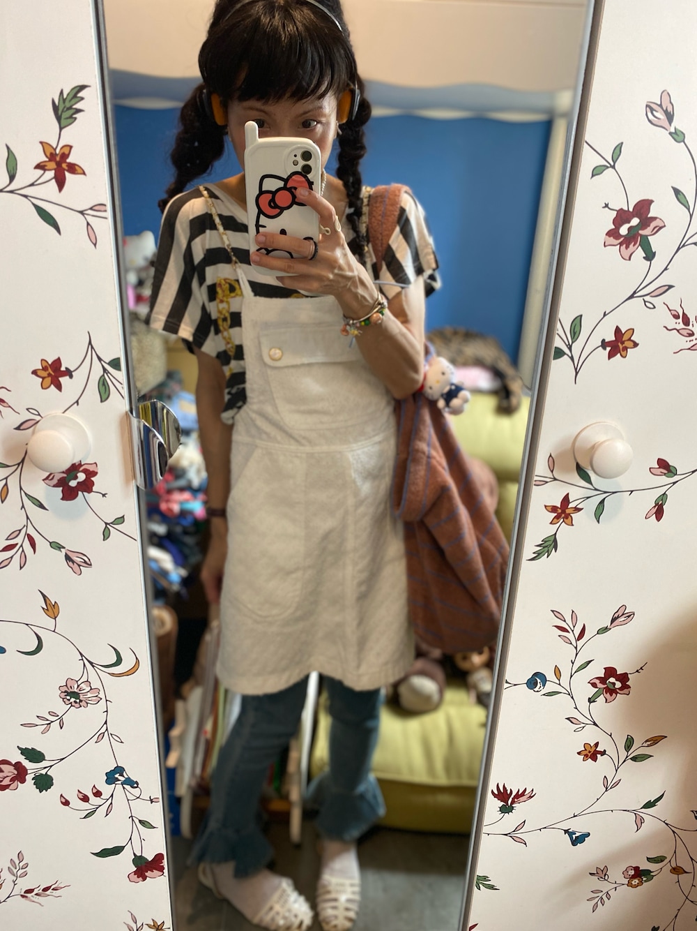 14 August 2023 Monday 🌤️ · ❤️💛💚💙💜❤️💛💚💙💜❤️💛💚💙💜 #Today outfit 🍄黑拼白間條塗鴉圖案Tee@Joyrich 🍄白色吊帶牛仔背帶裙 🍄淺藍色荷葉花邊牛仔褲 🍄珊瑚橙色蝴蝶結耳環 🍄復古心形相片吊墜/桃紅色貓貓水玉項鍊 🍄可愛KITTY小貓咪淡水珍珠項鍊 🍄冰淇淋糖果色軟糖珍珠小熊吊墜項鍊 🍄棕色拼藍色條紋毛巾Toto Bag 🍄米白色包頭平底鏤空鞋 ❤️💛💚💙💜❤️💛💚💙💜❤️💛💚💙💜