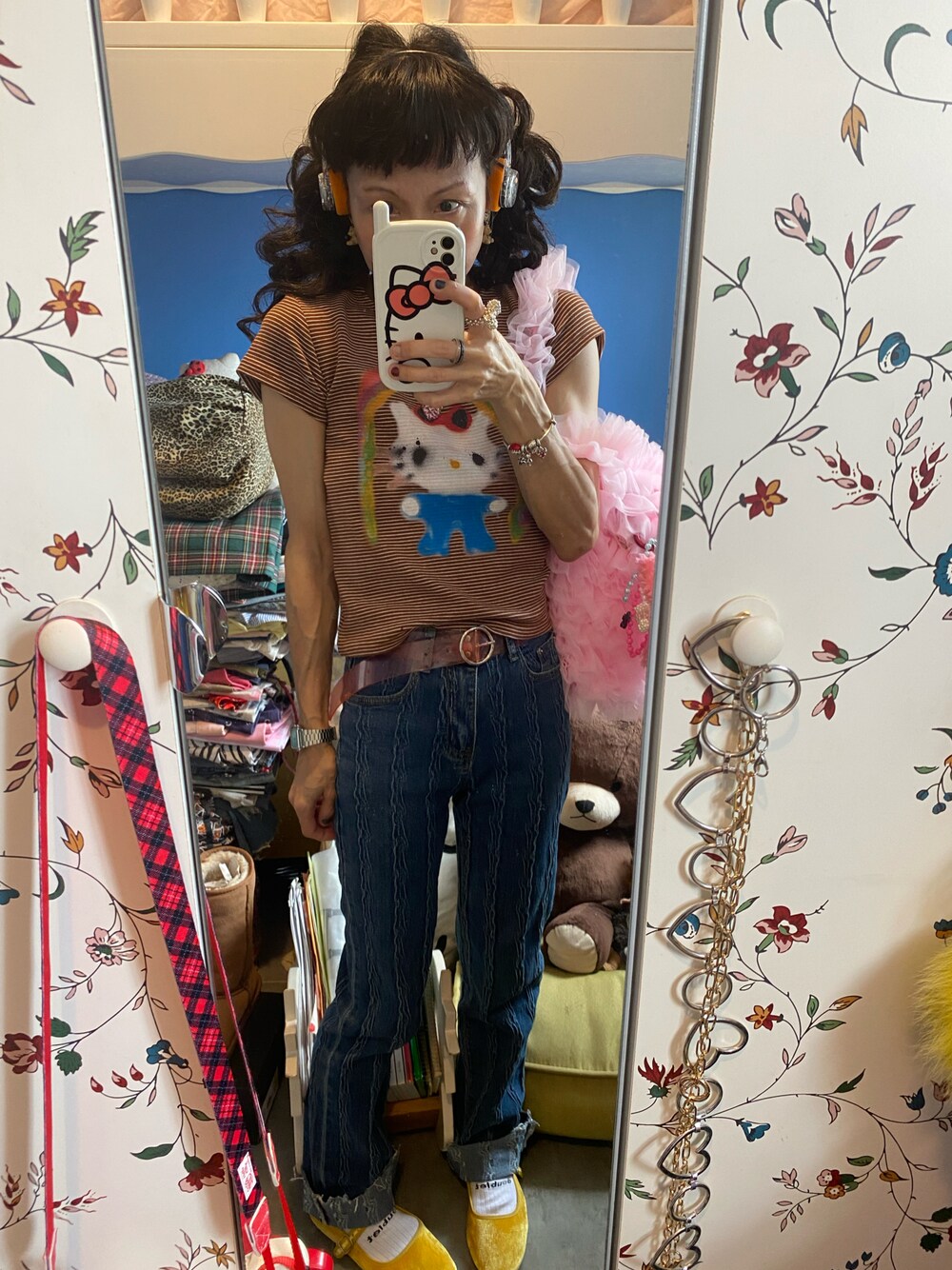30 June 2024 Sunday 🌦️⚡️ · ❤️💛💚💙💜❤️💛💚💙💜❤️💛💚💙💜 🍄彩虹Kitty棕色條紋短袖Tee 🍄The blotter藍色小喇叭牛仔褲 🍄泰迪熊愛心耳環 🍄心型項錬@apm monaco 🍄復古心形相片吊墜/桃紅色貓貓水玉項鍊 🍄粉紅色蕾絲網紗手提包 🍄黃色絲絨瑪麗珍圓頭芭蕾舞鞋 ❤️💛💚💙💜❤️💛💚💙💜❤️💛💚💙💜