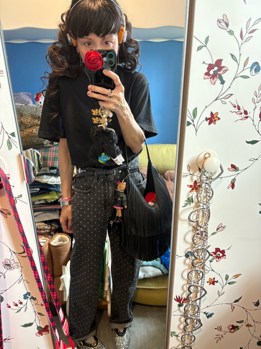 17 May 2025 Saturday 🌞 · ❤️💛💚💙💜❤️💛💚💙💜❤️💛💚💙💜 #Today outfit 🍄黑色豹紋髮夾圖案Tee@Tout a coup 🍄白色圓點黑色牛仔褲 🍄氣球耳環@apm monaco 🍄心型項錬@apm monaco 🍄復古心形吊墜/桃紅色貓貓水玉項鍊 🍄黑色流蘇單肩@Zara 🍄網面閃亮水鑽平底芭蕾鞋 ❤️💛💚💙💜❤️💛💚💙💜❤️💛💚💙💜