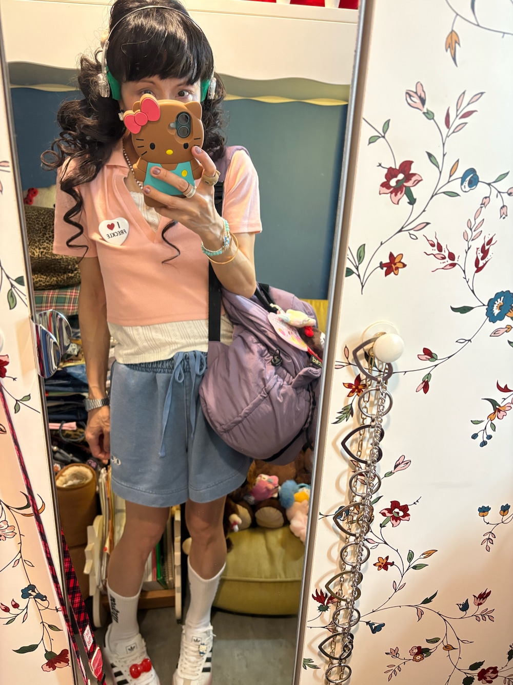 25 September 2025 Thursday 🌦️ ❤️💛💚💙💜❤️💛💚💙💜❤️💛💚💙💜 #Today outfit 🍄粉橙色polo短身Tee@Zara 🍄白色半袖藍色玫瑰襯衣@Zara 🍄牛仔布色短褲@OIC 🍄琺瑯釉立體鑲鑽白色小貓咪耳環 🍄棕色熊珠仔項鏈@Zara Kids 🍄復古心形吊墜/桃紅色貓貓水玉項鍊 🍄紫灰色蝴蝶結夾棉背囊@Zara Kids 🍄Hello Kitty厚底簡約黑白鞋 ❤️💛💚💙💜❤️💛💚💙💜❤️💛💚💙💜