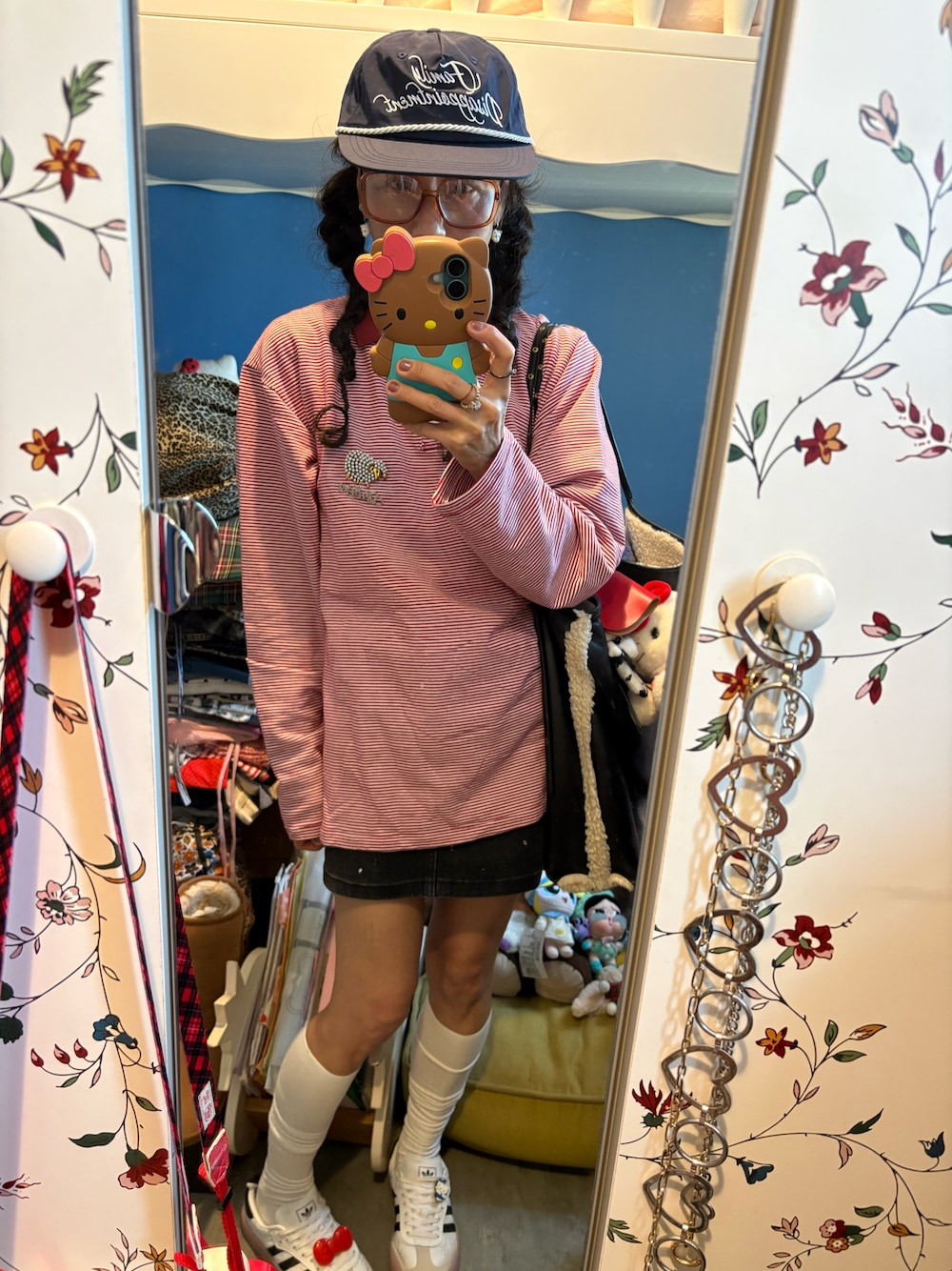 16 February 2026 Monday 🌤️ ❤️💛💚💙💜❤️💛💚💙💜❤️💛💚💙💜 #Today outfit 🍄紅色條紋polo領襯衫@Freckleseoul 🍄Ne-net貓頭黑色圓點Tee 🍄黑色鉆石牛仔裙@Urban Revivo 🍄琺瑯釉立體鑲鑽白色小貓咪耳環 🍄黑色心型串珠項鍊@Lowry Farms 🍄自制串珠Melody項鍊 🍄復古心形吊墜/桃紅色貓貓水玉項鍊 🍄Hello Kitty單肩斜挎口金鍊條包 🍄黑色皮/羔毛雙面用托特包@ Zara 🍄Hello Kitty厚底簡約黑白鞋 ❤️💛💚💙💜❤️💛💚💙💜❤️💛💚💙💜