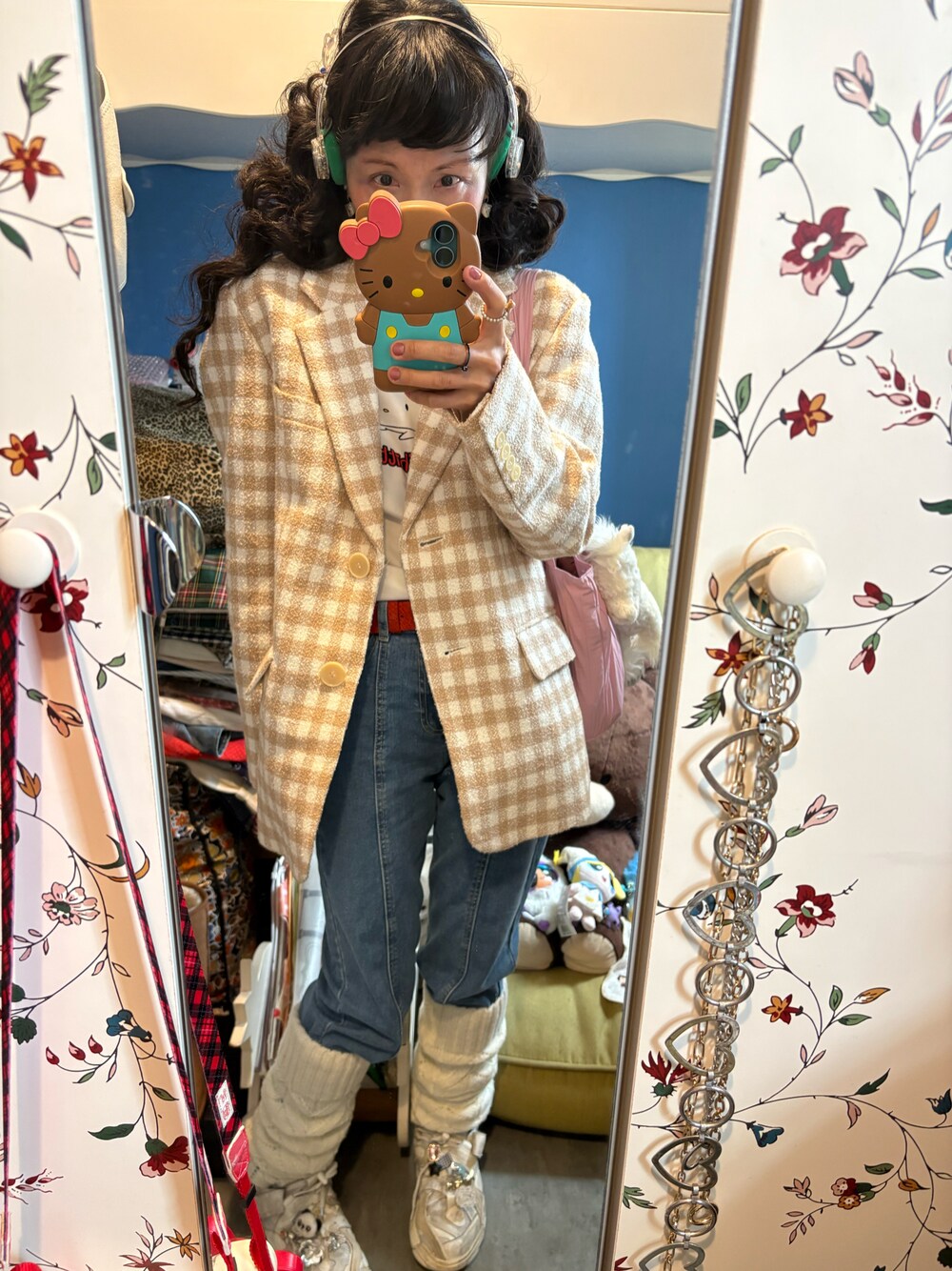 21 March 2026 Saturday 🌤️ ❤️💛💚💙💜❤️💛💚💙💜❤️💛💚💙💜 #Today outfit 🍄淺駝色格紋寬肩西裝外套 🍄Realbadgirl惡搞Hello Shitty Tee 🍄星星貼布靴型牛仔褲@Zara Kids 🍄琺瑯釉立體鑲鑽白色小貓咪耳環 🍄白色串珠花型吊咀項鍊@Lowrys Farm 🍄綠色自制串珠Hello Kitty項鍊 🍄復古心形吊墜/桃紅色貓貓水玉項鍊 🍄可愛小馬粉紅色單肩斜挎帆布袋 🍄白色Reebok波鞋 ❤️💛💚💙💜❤️💛💚💙💜❤️💛💚💙💜