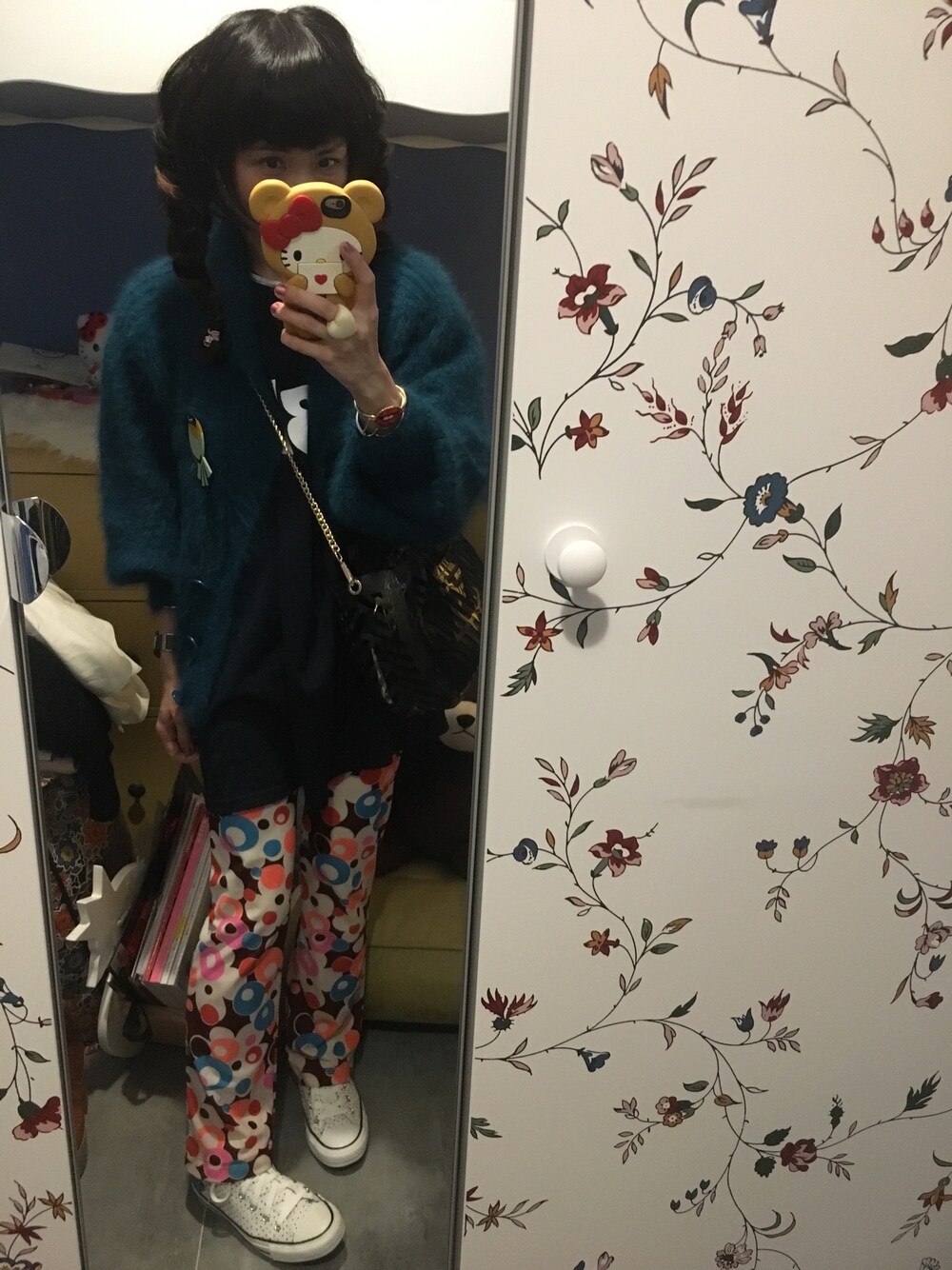 25 April 2017 Tuesday ☁️☔️⚡️ #Today outfit 🍄孔雀綠冷外套 🍄深藍色Obey Tee 🍄碎花小喇叭褲 🍄Choker@Murua 🍄白色converse鞋 🍄黑色透明膠手袋@Zara