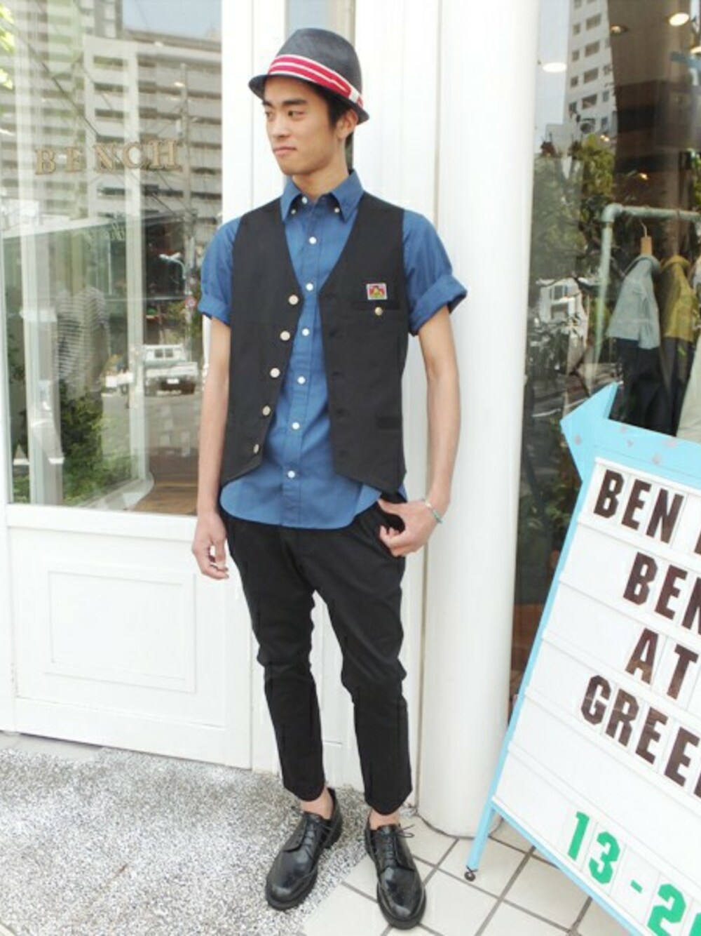ベストにボタンダウンのシャツというしっかりめのコーディネートにも遊び心&カジュアル感を取り入れたBEN DAVISならではのスタイリング。