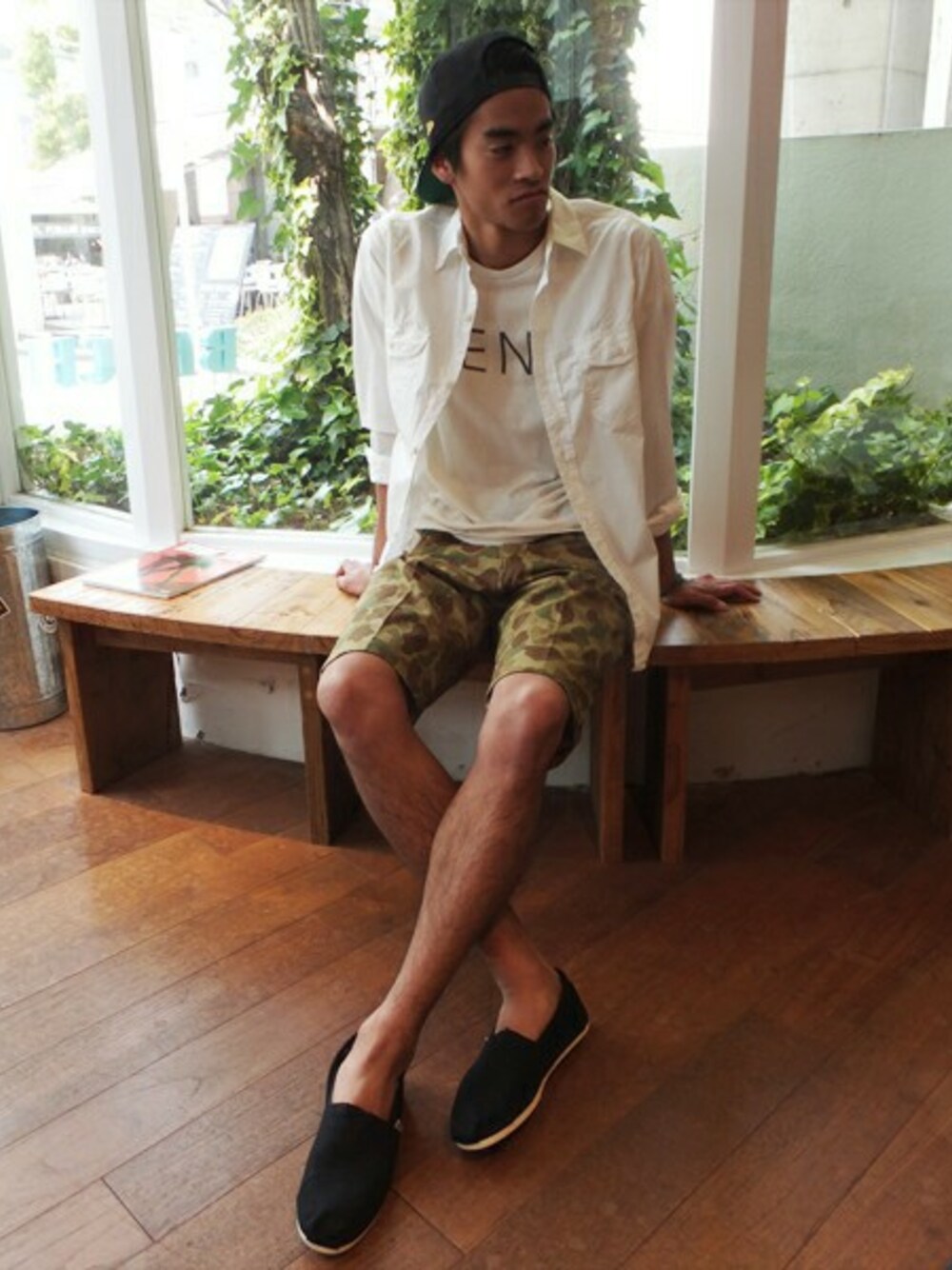 カモフラ柄のショーツは丈が丁度良く、Tシャツやシャツ、ジャケットとどんな組み合わせにもハマるアイテムです!今回はシャツとコーディネートしてキレイめ&春らしく軽やかな印象に。