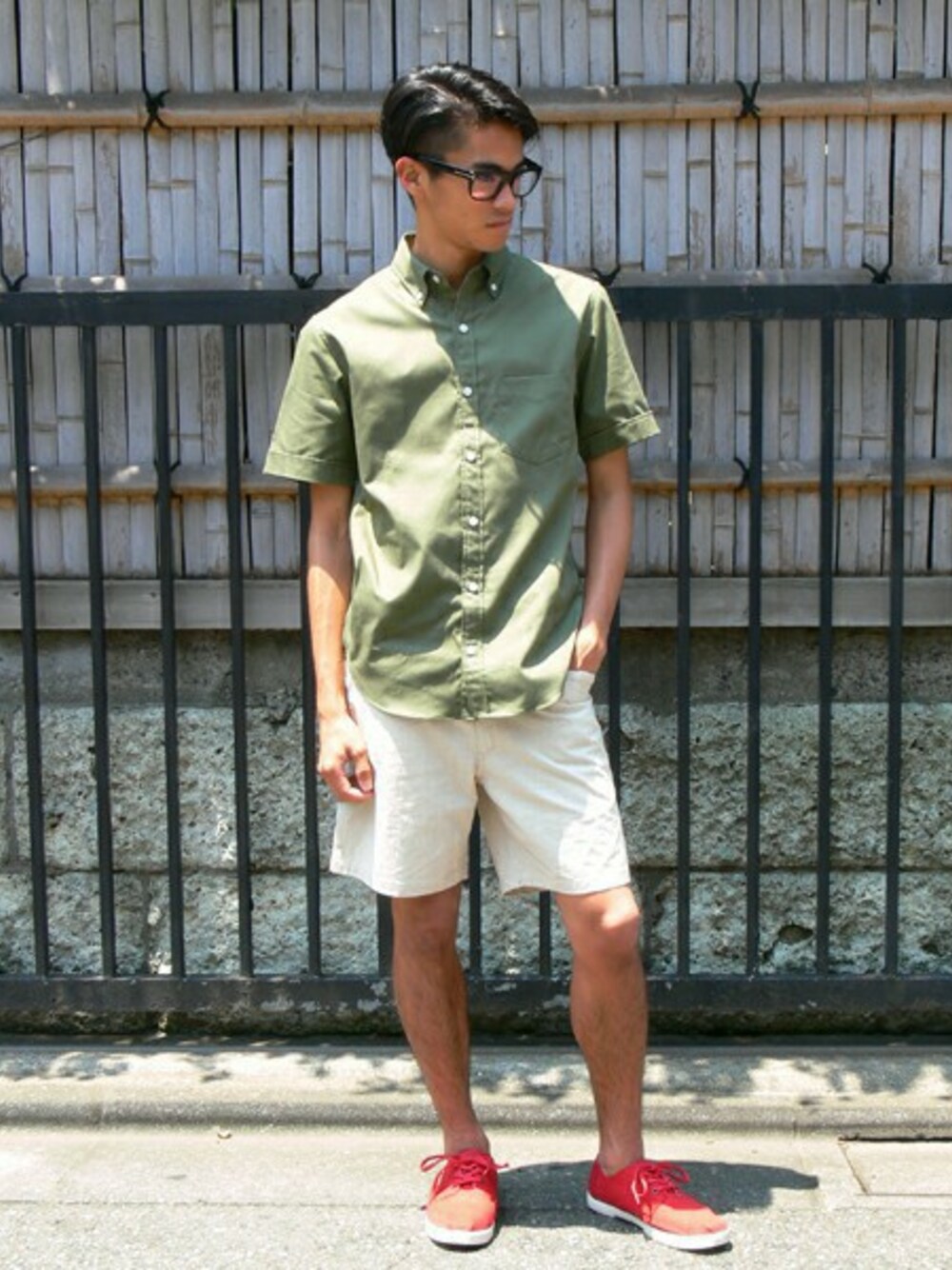 短い丈のショーツにはボタンダウンのシャツを合わせてカジュアルになりすぎない様にコーディネートしました。 上下アースカラーでまとまっているので足元にはアクセントを!