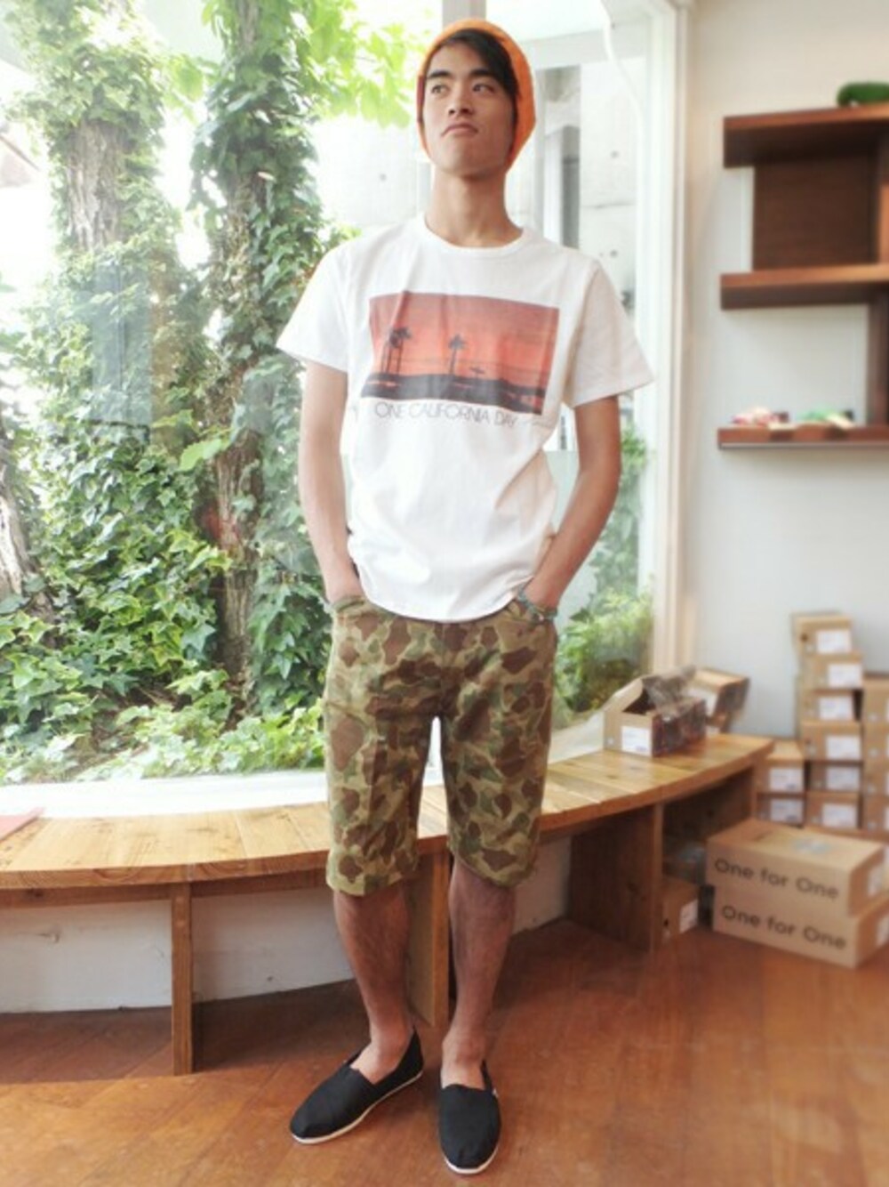 ONE CALIFORNIA DAYからカリフォルニアのビーチをプリントしたPHOTO TEEに、リラックスムードを引き立てるTOMSのシューズを合わせたコーディネート。