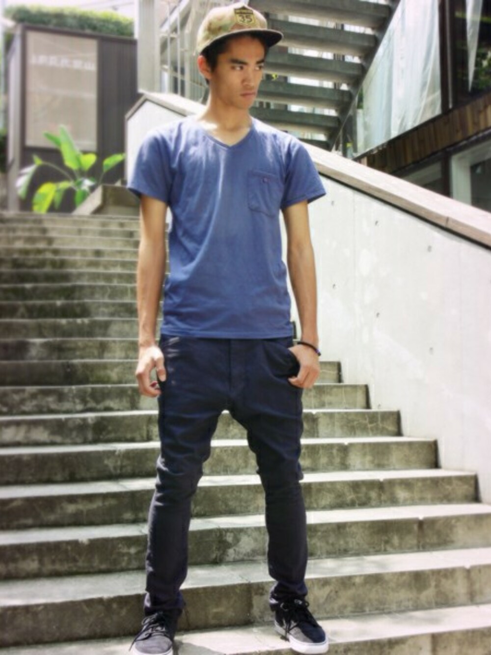 肌触りの良いクールマックス素材を用いたVネックTEEにBEN DAVISの新作パンツを合わせたコーデ。同系色の組み合わせでシンプルにまとめました。