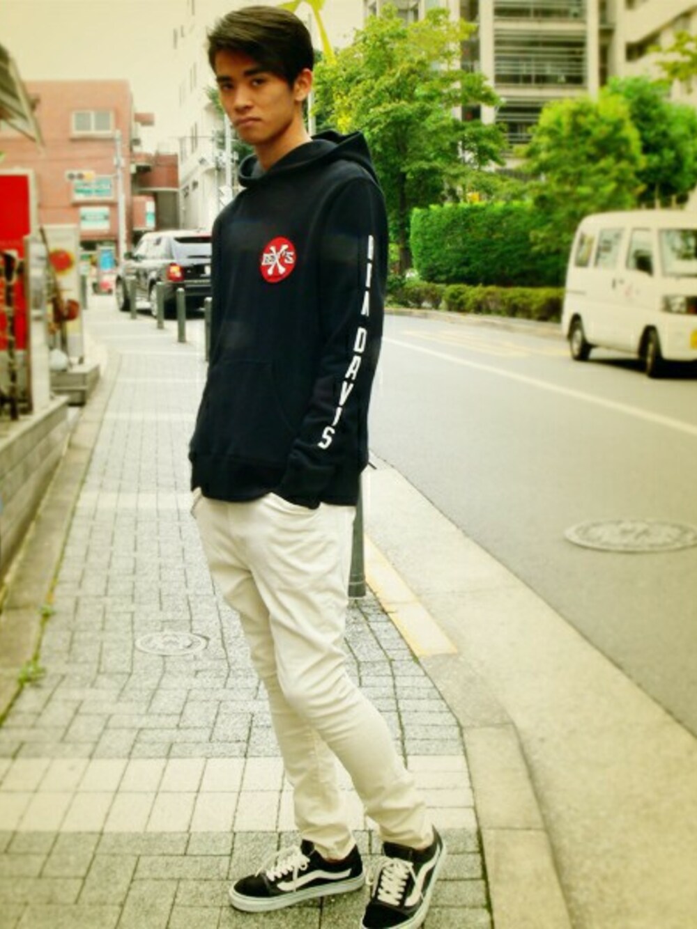 ルーズなシルエットのスウェットパーカーには細身のボトムスを合わせて、バランスよく着こなしたいものです。