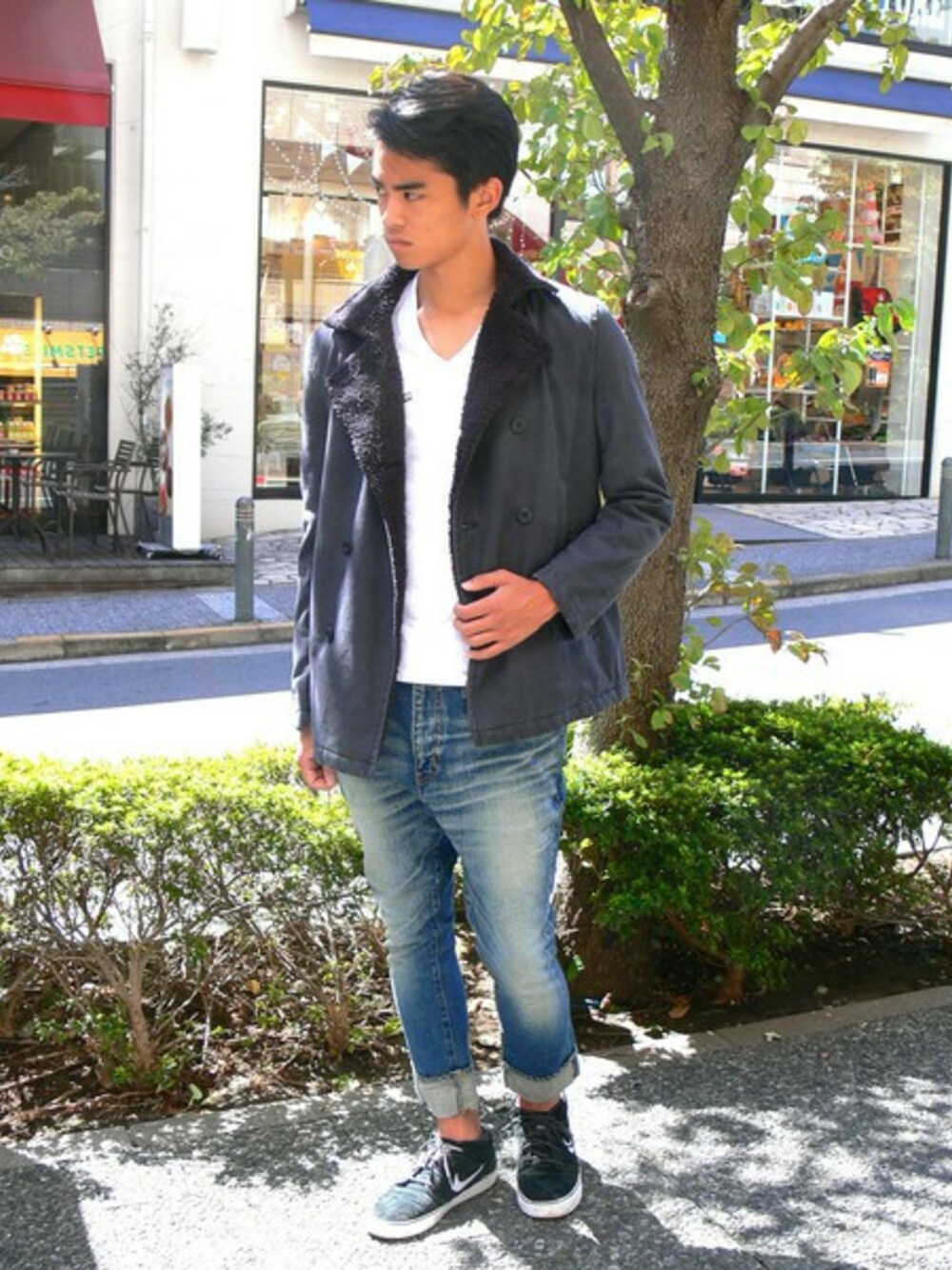 只今予約受付中のBEN DAVIS VILLAGE COATを用いたコーディネート。インナーのボアの暖かさもありながら、意外と軽い感じで羽織れるアウタージャケットにビンテージ風のデニムを合わせる事でこなれた感じに◎