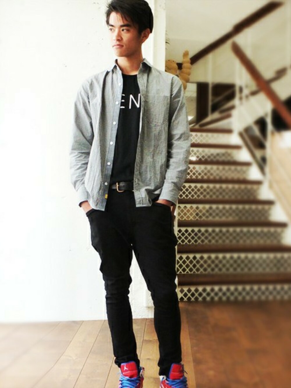 ボトムスとインナーを両方ブラックで合わせたので、シャツを羽織る事で春らしく軽い印象になるようにコーディネートしてみました。
