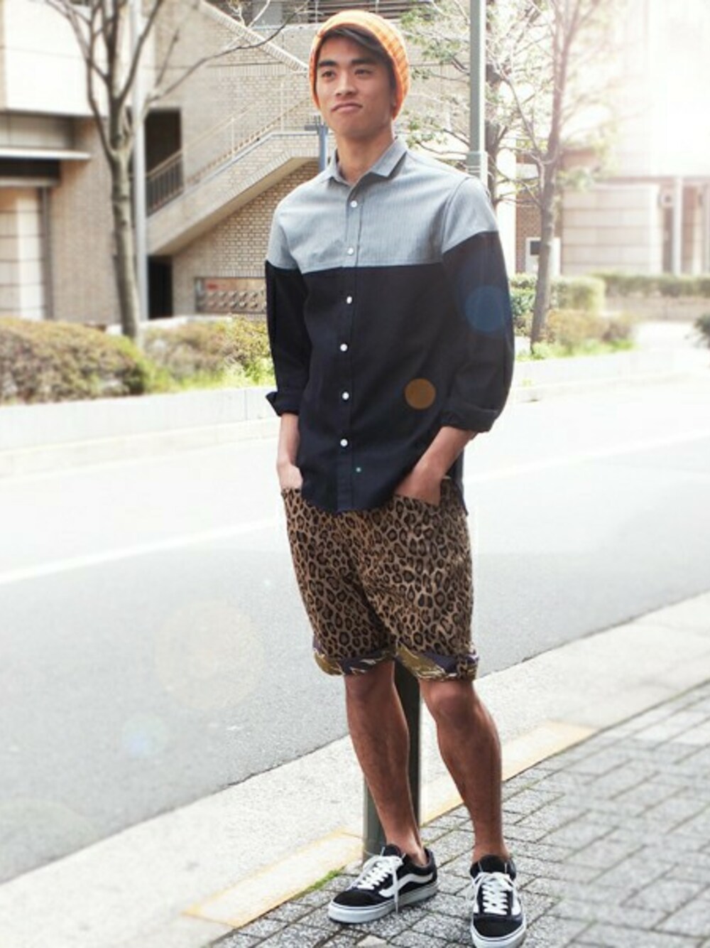 バイカラーシャツとレオパード柄のショーツという癖のあるアイテムでコーディネートに挑戦。