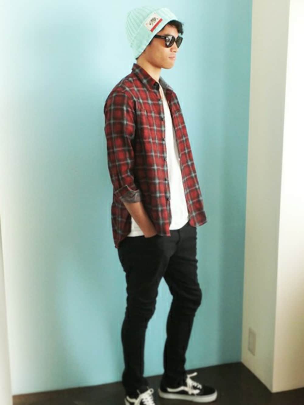 ジョッパーズシルエットのカラーデニムと、ロングテールシャツというBEN DAVIS PROJECT LINE大定番の組み合わせは。ニットキャップはわざとらしいくらいのカラーをチョイスしてはずしに。