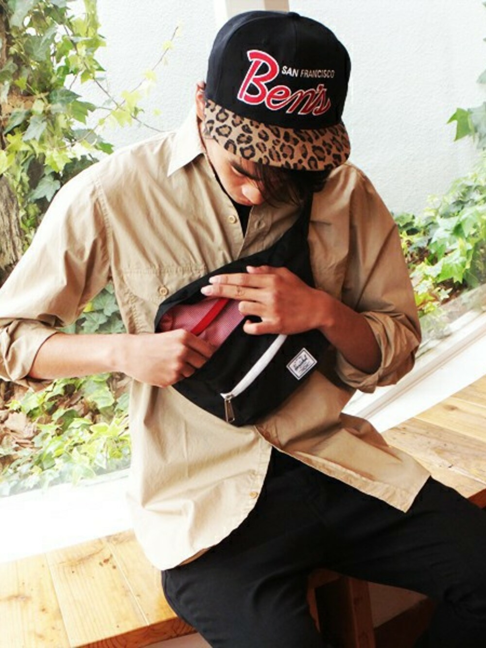 手ごろなサイズが使いやすいショルダーポーチ。物を出し入れする時にちらりと見える赤白ピンストライプのインナーでオシャレ度の高さが垣間見えます。