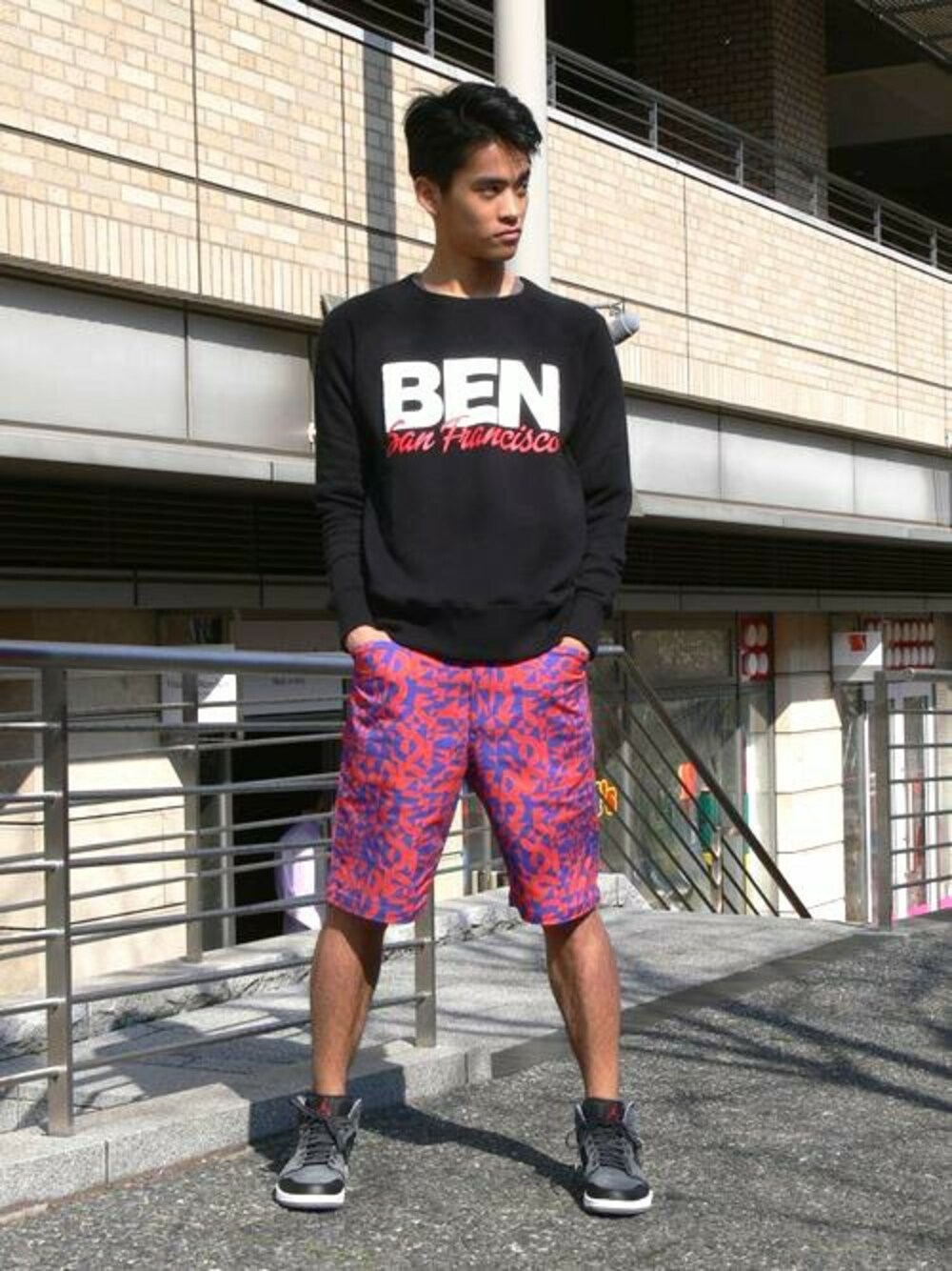 BEN DAVISのBENCH別注スウェットを用いたコーデ。Tシャツとのレイヤードスタイル。 インパクトのあるショーツと合わせて今年らしいコーディネートの完成です。